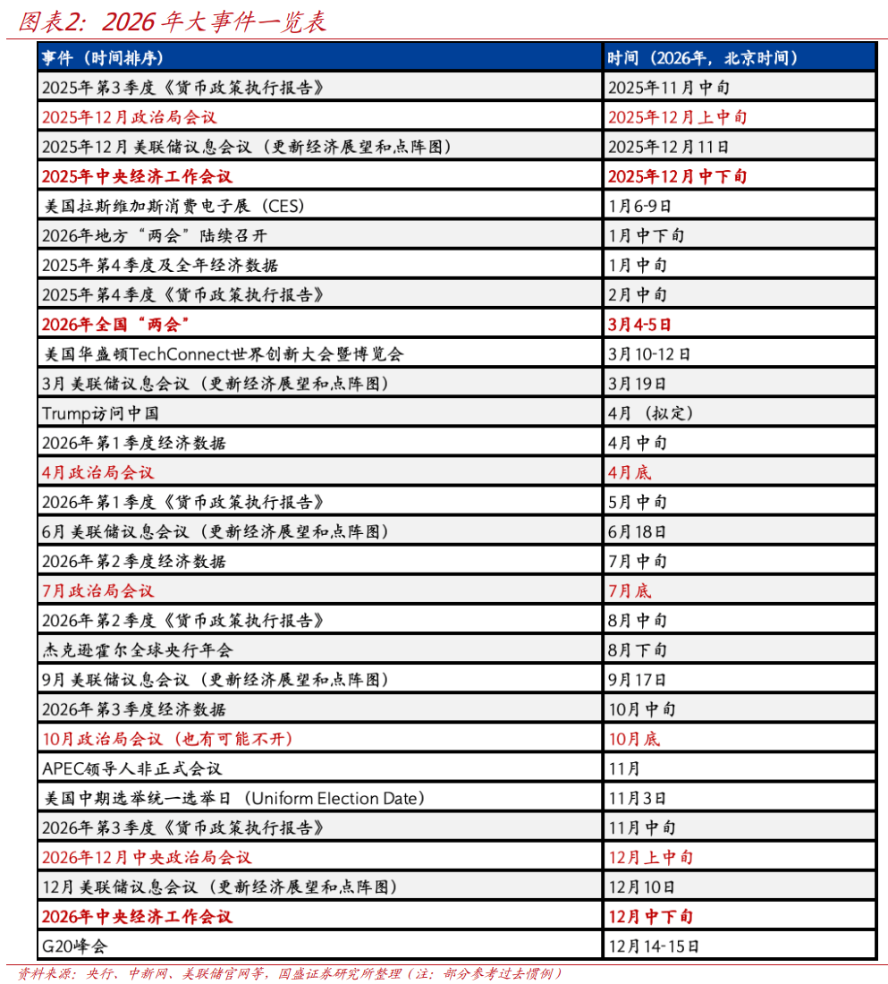 熊园、张浩、刘新宇、穆仁文、朱慧、薛舒宁熊园、刘安林(熊园 系国盛证券首席经济学家、中国首席经济学家论坛理事) 我们此前已经发布2026年度报告《乘势而上—2026年经济与资产展望》,总篇幅较长(64页pdf、89张图表、近6万字),现将报告的3个主体部分(政策 面、基本面、配置面)分别发送,本篇为2026年国内经济基本面展望。 核心结论:展望2026年,作为"十五五"开局之年,政策"全面发力"可期,主基调偏积极、偏扩张、偏刺激,进一步中央加杠杆、松货币、宽财政,促消 费、拉基建、强产业、稳地产、促改革。 5、"十五五":主线和方向已明晰,要求"夯实基础、全面发力",后续重视经济、科技+产业、民生、内需4条主线,关注投资于人、"中国人经济 (GNI)"的具体部署,也要关注定量目标设定(可能新增居民消费率提升指标)、新谋划一批重大项目等细节。 | 事件(时间排序) | 时间(2026年,北京时间) | | --- | --- | | 2025年第3季度《货币政策执行报告》 | 2025年11月中旬 | | 2025年12月政治局会议 | 2025年12月上中旬 | | 2025年12月美联储议息会议(更新经济展 ...