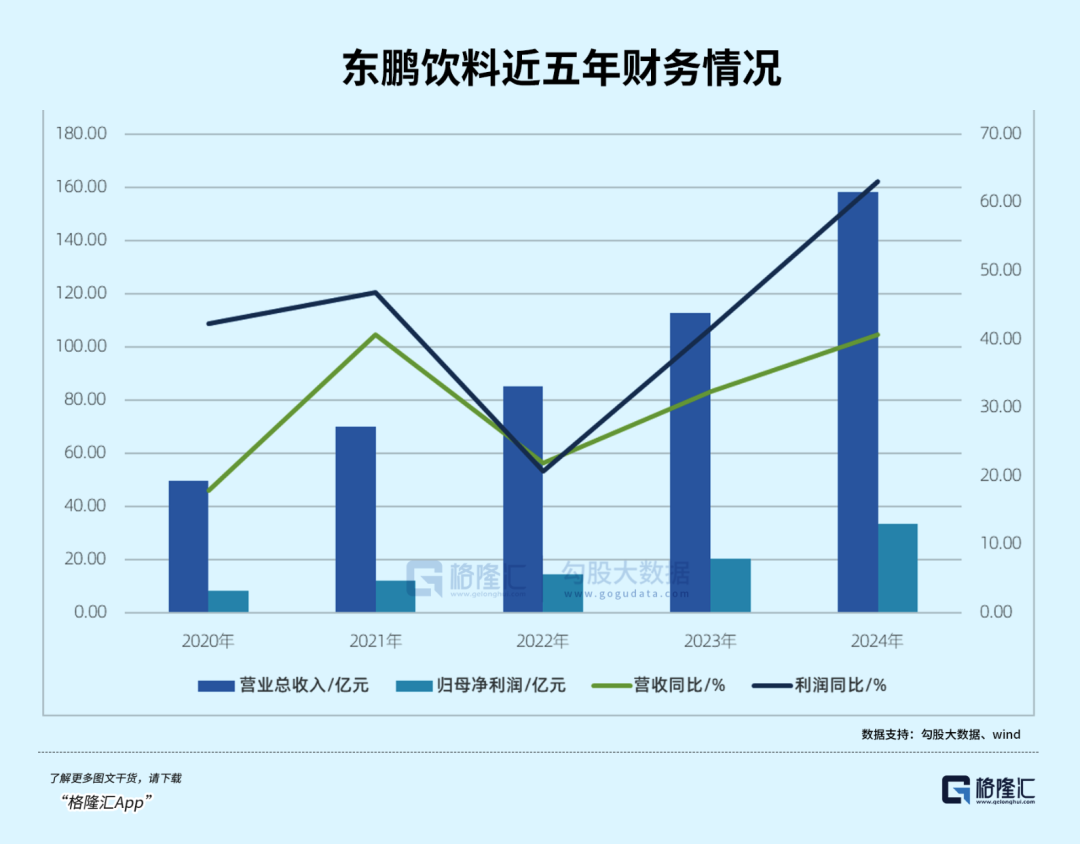 作者 | 远禾 数据支持 | 勾股大数 据(www.gogudata.com) 2021年,东鹏饮料登陆A股,成为国内"功能饮料第一股"。 而今年以来,东鹏饮料开始谋求"A+H"上市。 尼尔森的数据显示,2024年,东鹏特饮在国内能量饮料市场的销售量占比高达47.9%,连续四年成为销售量最高的功能性饮料。 作为国内功能饮料第一股,公司股价也一路高歌猛进,从2021年46.27元的发行价一路飙涨,至今已超过300元,总市值超1600亿元。 2024年,东鹏股份全年股价涨幅超80%,在整个食品饮料板块名列前茅。 股价飙涨背后,公司的业绩也突飞猛进。 近年来,东鹏饮料的业绩持续增长。2021年到2024年间,东鹏饮料营业收入从69.78亿元增长至158.39亿元,直接翻倍。 净利润也从11.93亿元增长至33.27亿元,2024年的同比增长率达到63.09%。 东鹏饮料于今年4月3日递交的港交所上市申请失效,但于10月9日,东鹏饮料对港交所再次递表。 作为目前消费品行业市值1600亿的龙头,"不差钱"的东鹏饮料着急港股上市到底为哪般? 01 在红牛深陷版权纠纷之时 ,东鹏饮料已经悄然成 为国内功能饮料的霸主。 在东 ...