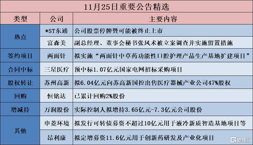 | | | 11月25日重要公告精选 | | --- | --- | --- | | 类型 | 公司 | 主要内容 | | 热点 | *ST东通 | 公司股票停牌暨可能被终止上市 | | | 富森美 | 副总经理、董事会秘书张风术被立案调查并实施留置措施 | | 签约项目 | 两面针 | 拟实施"两面针中草药功能性口腔护理产品生产基地扩建项目" | | 合同中标 | 三星医疗 | 预中标1.07亿元国家电网招标采购项目 | | 股权转让 | 苏州高新 | 拟6.04亿元向苏高新国控出售医疗器械产业公司47%股权 | | 回购 | 恒铭达 | 已累计回购2%股份 | | 增减持 | 万润股份 | 实际控制人拟增持3.65亿元-7.3亿元公司股份 | | 其他 | 申菱环境 | 拟发行可转债募资不超过10亿元用于液冷新质智造基地项目等 | | | 昂利康 | 拟定增募资11.6亿元用于创新药研发及产业化项目 写 節隆に | 【热点】 富森美(002818.SZ):副总经理、董事会秘书张凤术被立案调查并实施留置措施 *ST东通(维权)(300379.SZ):公司股票停牌暨可能被终止上市 【项目投资】 ST思科瑞(维 ...