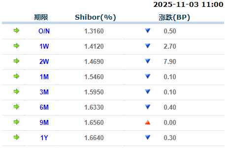 新华财经北京11月3日电(高二山)人民银行3日开展783亿元7天期逆回购操作,操作利率为1.40%,与此前持平;鉴于当日有3373亿元7 天期逆回购到期,公开市场实现净回笼2590亿元。 上海银行间同业拆放利率(Shibor)短期品种均下跌,14天品种跌破1.5%。具体来看,隔夜Shibor下跌0.50BP,报1.3160%;7天Shibor下 跌2.70BP,报1.4120%;14天Shibor下跌7.90BP,报1.4690%。 | | | | 2025-11-03 11:00 | | --- | --- | --- | --- | | | 期限 | Shibor(%) | 涨跌(BP) | | 1 | O/N | 1.3160 | 0.50 | | 个 | 1W | 1.4120 | 2.70 | | 中 | 2W | 1.4690 | 7.90 | | t | 1M | 1.5460 | 0.10 | | 个 | 3M | 1.5950 | 0.10 | | 价 | 6M | 1.6330 | 0.40 | | � | 9M | 1.6560 | 0.00 | | 企 | 1Y | 1.6640 |  ...