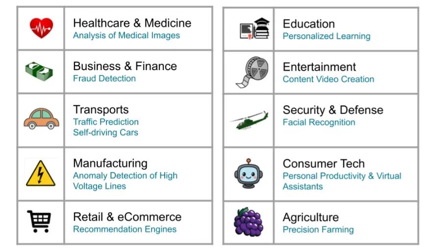 本文列举了十个日常生活中高度依赖人工智能 (AI) 来取得成功并保持竞争力的领域。当然,仅仅列举十个例子只是人工智 能应用普及程度的冰山一角。不过,在本文篇幅所限的情况下,我们选择的案例都与我们自身的经验以及人工智能的流行 应用密切相关。 | Healthcare & Medicine Analysis of Medical Images | Education Personalized Learning | | --- | --- | | Business & Finance Fraud Detection | Entertainment Content Video Creation | | Transports Traffic Prediction Self-driving Cars | Security & Defense Facial Recognition | | Manufacturing Anomaly Detection of High Voltage Lines | Consumer Tech Personal Productivity & Virtual Assistants | | Re ...