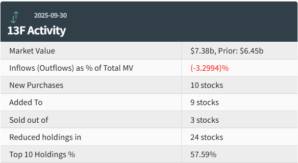 Core Insights - Appaloosa LP, led by David Tepper, reported a total market value of $7.38 billion for its U.S. stock holdings as of September 30, 2025, reflecting a 14% increase from the previous quarter's $6.45 billion [1][2] Holdings Summary - Appaloosa added 10 new stocks, increased holdings in 9 stocks, reduced holdings in 24 stocks, and completely sold out of 3 stocks [1][2] - The top 10 holdings accounted for 57.59% of the total market value [2] Top Holdings - Alibaba (BABA.US) is the largest holding with 6.45 million shares valued at approximately $1.15 billion, representing 15.61% of the portfolio, down 8.73% from the previous quarter [3][4] - Amazon (AMZN.US) is the second largest holding with 2.5 million shares valued at about $550 million, accounting for 7.43% of the portfolio, down 7.41% [3][4] - Whirlpool (WHR.US) ranks third with 5.5 million shares valued at approximately $432 million, making up 5.85% of the portfolio, with a significant increase in holdings by 1966.95% [3][4] - Nvidia (NVDA.US) is the fourth largest holding with 1.9 million shares valued at around $354 million, representing 4.80% of the portfolio, up 8.57% [3][4] - Google (GOOG.US) is the fifth largest holding with approximately 1.39 million shares valued at about $337 million, accounting for 4.58% of the portfolio, down 7.50% [3][4] Significant Transactions - Appaloosa significantly increased its stake in the KraneShares CSI China Internet ETF (KWEB.US), Qualcomm (QCOM.US), and Baidu (BIDU.US) [4] - The firm completely sold out of Intel (INTC.US), Oracle (ORCL.US), and Beike (BEKE.US) [5] - The top five purchases by percentage change in the portfolio included Whirlpool, AMD (AMD.US), KWEB, Qualcomm, and Fiserv (FISV.US) [6][7] - The top five sales by largest value included UnitedHealth (UNH.US), Intel, Vistra Energy (VST.US), Amazon, and Meta (META.US) [6][7]