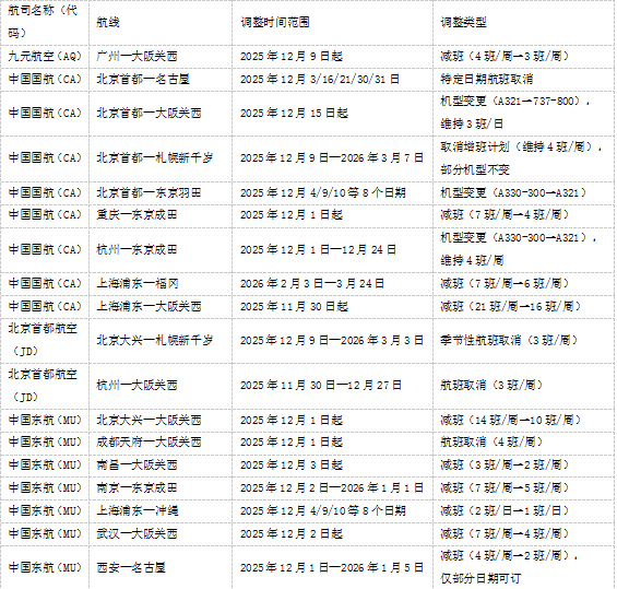 (原标题:中日航线每周减少156航班 影响波及元旦春节假期) 值得一提的是,除了减班,国航、东航、南航等航司还通过调整机型的方式,给中日航线运输量减员, 一些原定用大飞机执飞的中日航线被调整为小机型。 21世纪经济报道记者 高江虹 受日本首相言论事件影响的中日航线冲击波升级。 从12月1日起中国航司原定的中日航班未来数月将面临较大规模的减班和取消,时间跨度覆盖元旦和春 节,直至2026年3月底。 其中吉祥航空减班力度最大,从每周执飞114班日本航线(单向),减少35班 / 周,占其日本航线总量 的31%。南航、深航和东航亦每周分别减少23、22和18班。 长龙航空每天一班的赴日航线12月的全部航班取消。天津航空取消了每周3班的"贵阳到大阪"航班计 划,该航司取消12月日本航线整体频次从每周14班减少至6班。 航班管家DAST监测也显示,未来一周赴日计划航班取消率将在11月27日达到21.6%,目前已有12条航 线取消所有航班。受此影响,计划今年冬天去日本滑雪或者过春节的消费者,或许需要重新规划行程。 21世纪经济报道记者在AeroRoutes网站梳理了16家中国航空公司发布的日本航线调整通知,截至11月22 ...