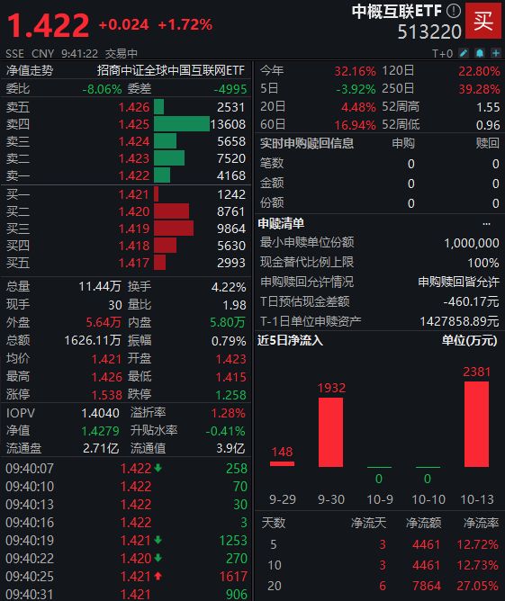 AI开源生态大会即将开幕!同赛道年内份额唯一正增长,中概互联ETF(513220)直线拉涨!