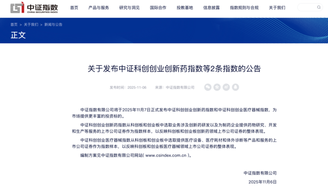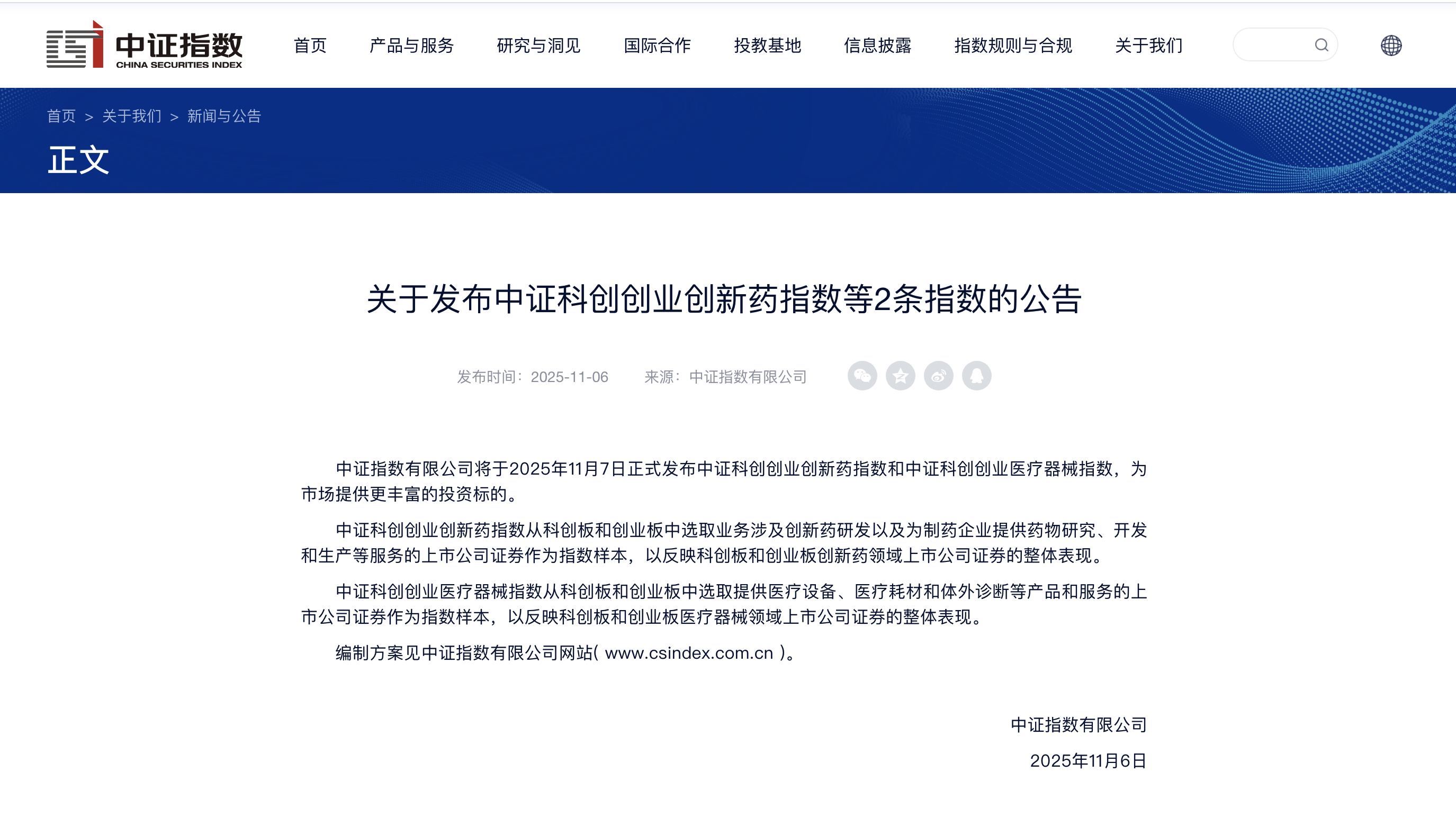 中证科创创业创新药指数和中证科创创业医疗器械指数将在11月7日发布