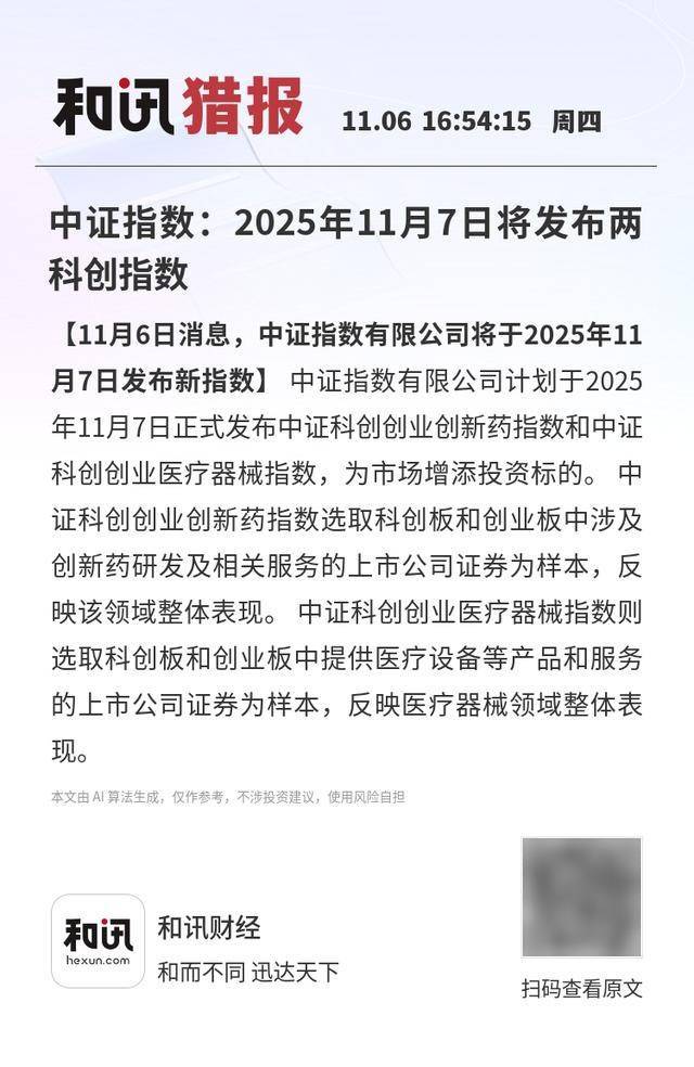 和讯猎报 11.06 16:54:15 脚 中证指数:2025年11月7日将发布两 科创指数 【11月6日消息,中证指数有限公司将于2025年11月7日发布新指数】中证指数有限公司计划于2025年11 月7日正式发布中证科创创业创新药指数和中证科创创业医疗器械指数,为市场增添投资标的。 中证科 创创业创新药指数选取科创板和创业板中涉及创新药研发及相关服务的上市公司证券为样本,反映该领 域整体表现。 中证科创创业医疗器械指数则选取科创板和创业板中提供医疗设备等产品和服务的上市 公司证券为样本,反映医疗器械领域整体表现。 本文由 AI 算法生成,仅作参考,不涉投资建议,使用风险自担 扫码查看原文 【11月6日消息,中证指数有限公司将于2025年11 月7日发布新指数】 中证指数有限公司计划于2025 年11月7日正式发布中证科创创业创新药指数和中证 科创创业医疗器械指数,为市场增添投资标的。中 证科创创业创新药指数选取科创板和创业板中涉及 创新药研发及相关服务的上市公司证券为样本,反 映该领域整体表现。中证科创创业医疗器械指数则 选取科创板和创业板中提供医疗设备等产品和服务 的上市公司证券为样本,反映医疗器械领域 ...