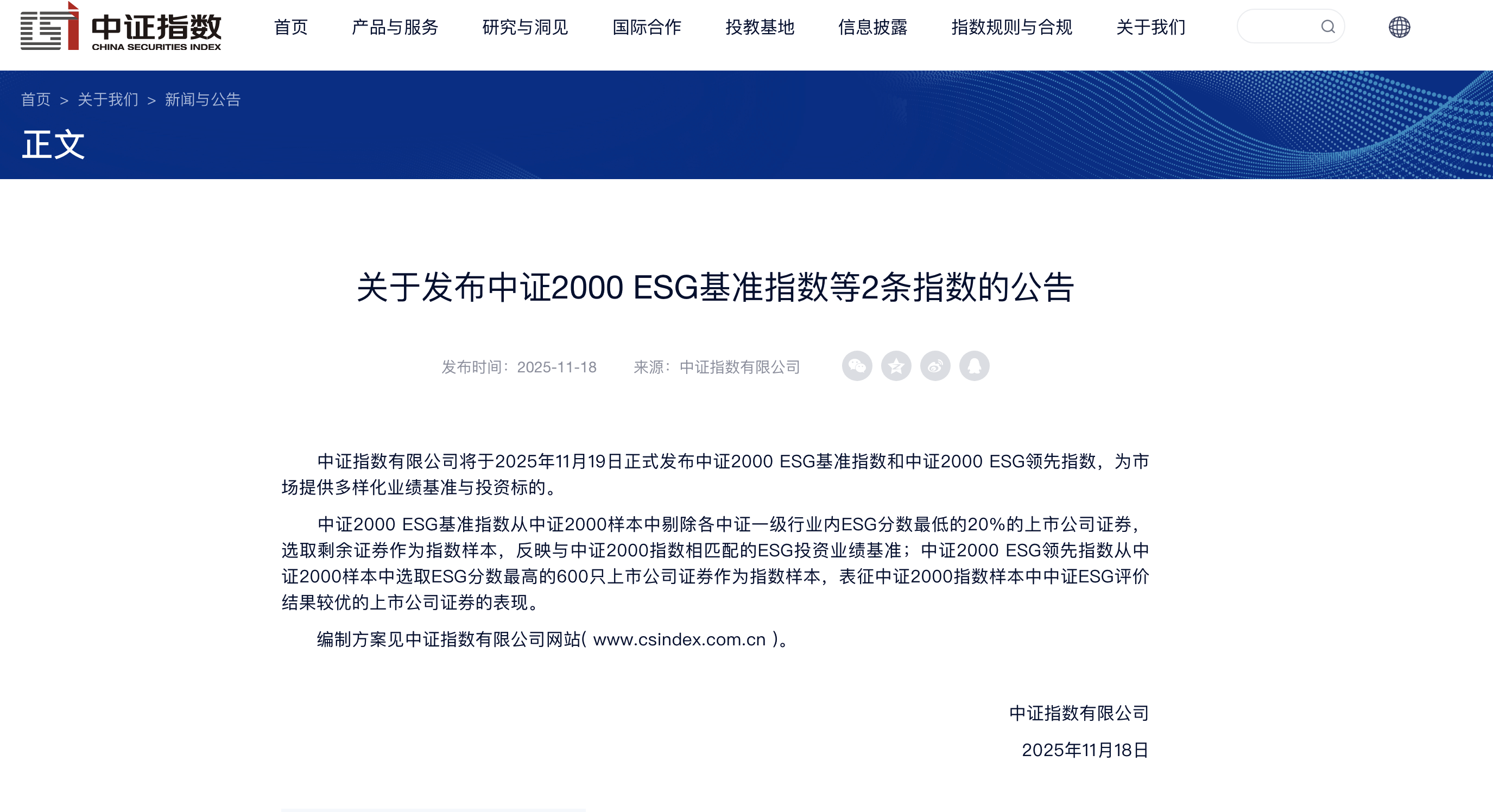 中证指数公司:将发布中证2000 ESG基准指数等2条指数