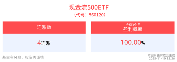 跟踪精度方面,截至2025年11月7日,现金流500ETF近3月跟踪误差为0.029%。 现金流500ETF(560120)紧密跟踪中证500自由现金流指数,中证500自由现金流指数从中证500指数样本 中选取50只自由现金流率较高的上市公司证券作为指数样本,以反映中证500指数样本中现金流创造能 力较强的上市公司证券的整体表现。 截至2025年11月10日13:36,中证500自由现金流指数强势上涨1.21%,成分股首旅酒店、吉祥航空、王 府井、益丰药房、华峰化学等个股领涨。现金流500ETF(560120)上涨0.76%, 冲击4连涨。 从收益能力看,截至2025年11月7日,现金流500ETF自成立以来,最高单月回报为7.97%,最长连涨月 数为3个月,最长连涨涨幅为15.21%,涨跌月数比为3/0,上涨月份平均收益率为4.86%,月盈利百分比 为100%,月盈利概率为100%,历史持有3个月盈利概率为100%。 回撤方面,截至2025年11月7日,现金流500ETF成立以来最大回撤3.18%,相对基准回撤1.85%。回撤后 修复天数为7天。 | 股票代码 | 股票简称 | 涨跌幅 | 权重 | | - ...