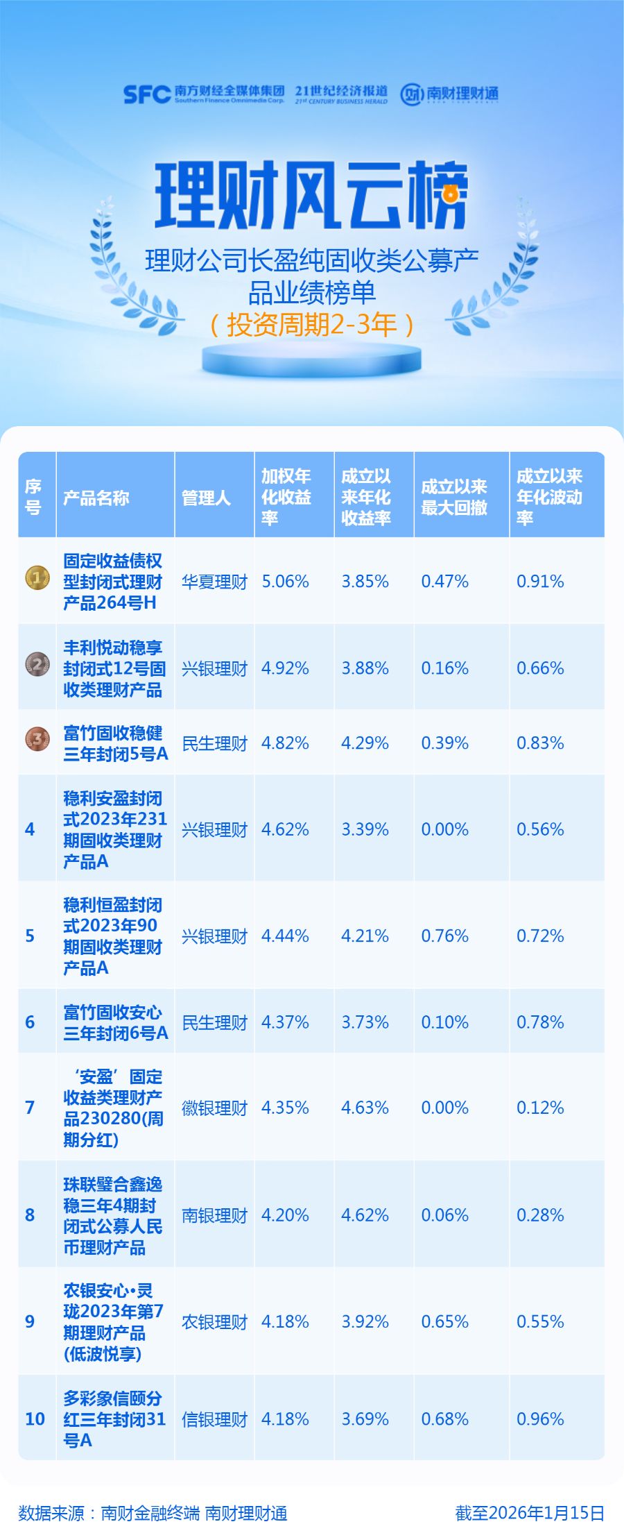 集团 21世纪经济报道 理财公司长盈纯同收类公 品业绩榜单 (投资間期2-3年 | 10 पुरा | 产品名称 | 加权年 管理人 化妆盖 | 同本7月以 来年化 | 成立以来 最大回撤 | 成立儿来 年化波动 | | --- | --- | --- | --- | --- | --- | | | | 제 | 1次学室 | | ਸੀ | | | 固體收益情权 243 | 华夏理财 5.06% | 3.85% | 0.47% | 0.91% | | | 产品264号H | | | | | | | 丰利悦动稳享 到2502号码 收益率用心产品 | 兴银理财 4.92% | 3.88% | 0.16% | 0.66% | | | 雪前固收稳健 三年5175号A | 最佳理财 4.82% | 4.29% | 0.39% | 0.83% | | | 稳利 - - - - - - 式2023年231 | | | | | | 4 | 期固收类理财 | 兴银理财 4.62% | 3.39% | 0.00% | 0.56% | | | 产品A | | | | | | | 北十四四十年号 | | | | | 二级资本债方面同样 ...