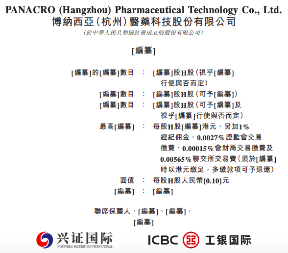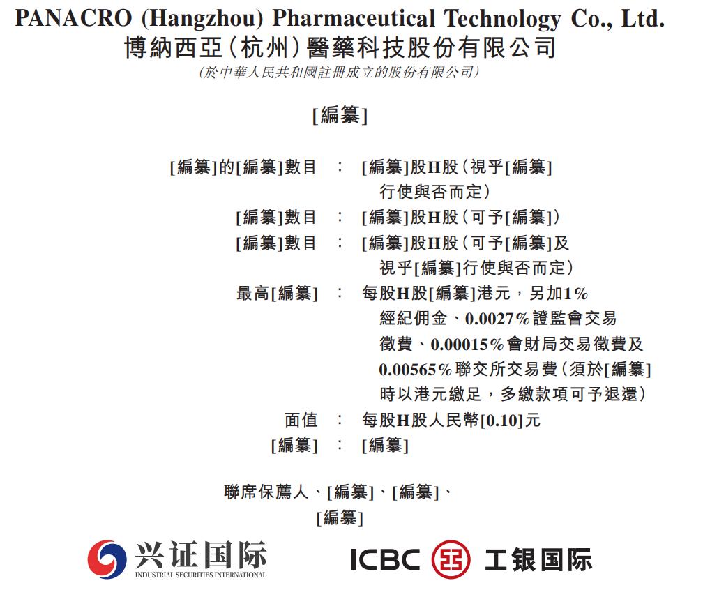 行使與否而定) 視乎[編纂]行使與否而定) 最高[編纂] : 每股H股[編纂]港元,另加1% 据港交所2月11日披露,博纳西亚(杭州)医药科技股份有限公司(简称:博纳西亚)向港交所主板递交上市申请,兴证国际、工银国际为其联席 保荐人。招股书披露,博纳西亚是一家总部位于中国杭州的临床合同研究组织(「CRO」)机构,致力于通过数字化赋能创新药临床研究。公 司的核心业务是为国内外制药及生物技术公司提供临床试验技术服务,旨在加速化学药物和生物制品的研发及商业化进程。 PANACRO (Hangzhou) Pharmaceutical Technology Co., Ltd. 博納西亞(杭州)醫藥科技股份有限公司 (於中華人民共和國註冊成立的股份有限公司) [編纂] [編纂]的[編纂]數目 : [編纂]股H股(視乎[編纂] 聯席保薦人·[編纂]·[編纂]· [繼臺] ICBC (E) 工银国际 「編纂]數目 :「編纂]股H股(可予[編纂]) 「編纂]股H股(可予[編纂]及 [編纂]數目 0.00565%聯交所交易費(須於[編纂] 時以港元繳足,多繳款項可予退還) 面值 : 每股H股人民幣[0.10]元 經紀佣金、0.0 ...