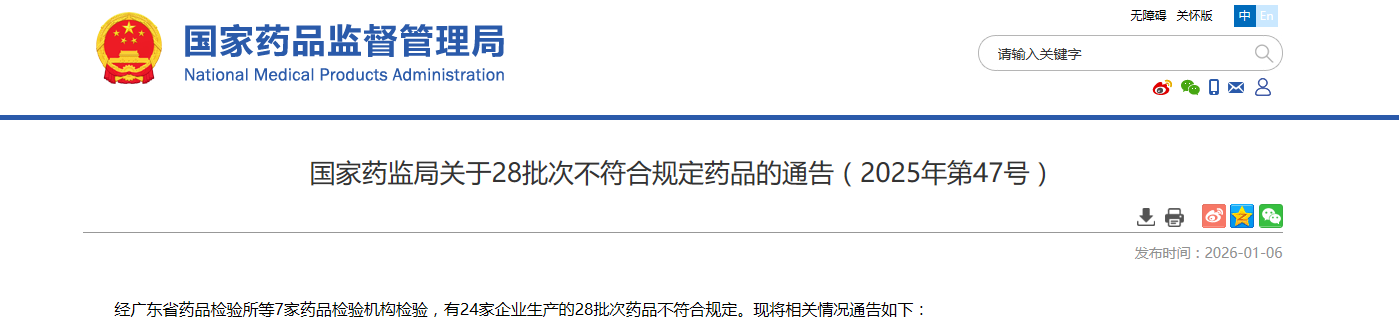 国家药监局关于28批次不符合规定药品的通告(2025年第47号)