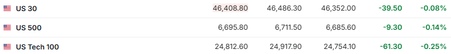 | ■ US 30 | 46,408.80 | 46,486.30 | 46,352.00 | -39.50 | -0.08% | | --- | --- | --- | --- | --- | --- | | = US 500 | 6,695.80 | 6.711.50 | 6,685.60 | -9.30 | -0.14% | | = US Tech 100 | 24,812.60 | 24,917.90 | 24.754.10 | -61.30 | -0.25% | 2. 截至发稿,德国DAX指数跌0.10%,英国富时100指数涨0.04%,法国CAC40指数涨0.16%,欧洲斯托克50指数跌0.11%。 | 德国30 | 2025年12月 | 23,275.30 | 23,337.00 | 23,176.80 | -23.70 | -0.10% | | --- | --- | --- | --- | --- | --- | --- | | 法国40 | 2025年12月 | 7,974.30 | 7,998.80 | 7,948.30 | +3.30 | +0.04% | | 张 英国100 | 20 ...