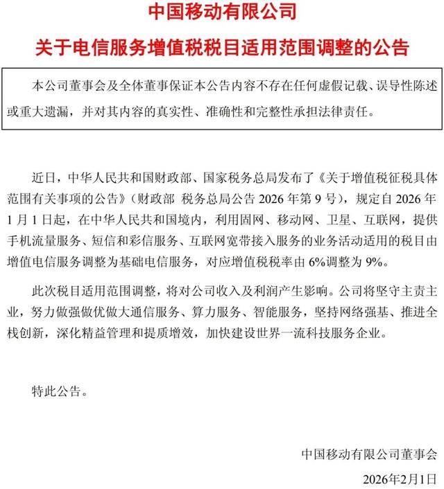 中国电信2月1日公告,近日,中华人民共和国财政部、国家税务总局发布《关于增值税征税具体范围有 关事项的公告》,规定自2026年1月1日起,在中华人民共和国境内,利用固网、移动网、卫星、互联 网,提供手机流量服务、短信和彩信服务、互联网宽带接入服务的业务活动适用的税目由增值电信服务 调整为基础电信服务,对应增值税税率由6%调整至9%。本次增值税税目适用范围调整,将对公司收入 和利润产生影响。公司将全面实施云改数转智惠战略,加快科技型企业建设,全面推进AI+行动,持续 打造"算力+平台+数据+模型+应用"的一体化智能云服务,加快培育发展新动能,推动提质降本增效, 持续推进企业高质量发展。 来源 | 智通财经综合证券时报网 审核 | 卢长银 编辑 | 王晓娇 中国移动、中国联通、中国电信,同日公告 中国移动2月1日公告,近日,中华人民共和国财政部、国家税务总局发布了《关于增值税征税具体范围 有关事项的公告》,规定自2026年1月1日起,在中华人民共和国境内,利用固网、移动网、卫星、互联 网,提供手机流量服务、短信和彩信服务、互联网宽带接入服务的业务活动适用的税目由增值电信服务 调整为基础电信服务,对应增值税税率由6 ...