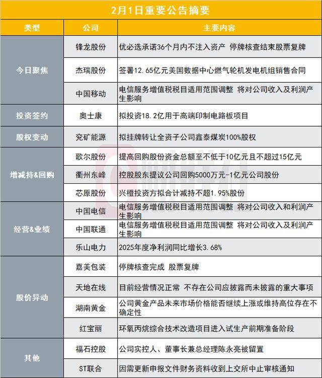 | | | 2月1日重要公告摘要 | | --- | --- | --- | | 类型 | 公司 | 主要内容 | | 今日聚焦 | 锋龙股份 杰瑞股份 | 优必选承诺36个月内不注入资产 停牌核查结束股票复牌 签署12.65亿元美国数据中心燃气轮机发电机组销售合同 | | | 中国移动 | 电信服务增值税税目适用范围调整 将对公司收入及利润产 | | | | 生影响 | | 投资签约 | 奥士康 | 拟投资18.2亿用于高端印制电路板项目 | | 股权变动 | 究矿能源 | 拟挂牌转让全资子公司鑫泰媒炭100%股权 | | 增减持&回购 | 歌尔股份 | 提高回购股份资金总额至不低于10亿元且不超过15亿元 | | | 衛州东峰 | 控股股东提议公司回购5000万元-1亿元公司股份 | | | 芯原股份 | 兴橙投资方拟合计减持不超1.95%股份 | | 经营&业绩 | 中国电信 中国联通 | 电信服务增值税税目适用范围调整 将对公司收入和利润产 生影响 电信服务增值税税目适用范围调整 将对公司收入及利润产 | | | | 生影响 | | | 乐山电力 | 2025年度净利润同比增长3.68% | | 股价 ...