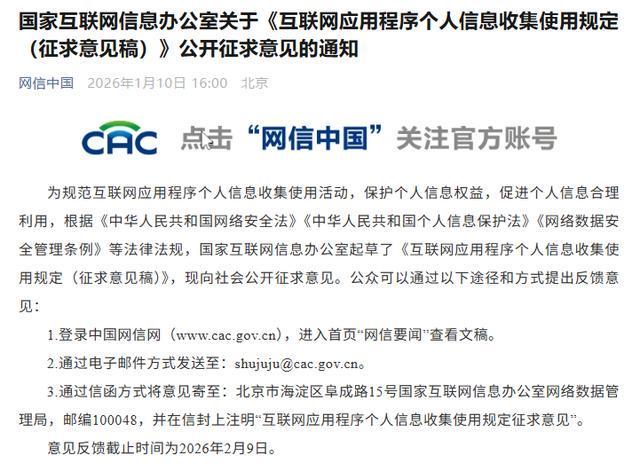 事关应用程序个人信息收集使用 国家网信办公开征求意见