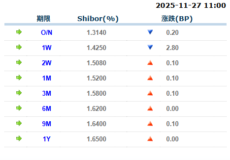 Group 1 - The People's Bank of China conducted a 356.4 billion yuan 7-day reverse repurchase operation at an interest rate of 1.40%, maintaining the previous rate, resulting in a net injection of 56.4 billion yuan after 300 billion yuan of reverse repos matured on the same day [1] - The Shanghai Interbank Offered Rate (Shibor) showed slight fluctuations, with the overnight Shibor decreasing by 0.20 basis points to 1.3140%, and the 7-day Shibor decreasing by 2.80 basis points to 1.4250% [1][2] - In the interbank pledged repo market, short-term funding prices fluctuated within 3 basis points, with R007 transaction volume exceeding 15%. The weighted average rates for DR001 and R001 decreased by 0.1 basis points and increased by 0.3 basis points, respectively [4] Group 2 - The overall funding situation remained balanced and slightly loose, with major banks providing sufficient funding supply. Overnight repo rates and certificate of deposit prices opened around 1.45%, with 7-day repo rates declining from 1.52% to around 1.50%-1.51% [9] - In the interbank certificate of deposit market, trading sentiment was generally weak, with the issuance of 1-month and 3-month certificates being the only active ones. The yields for 3-month and 6-month certificates increased slightly, while 1-year rates remained stable [10] - On November 27, the head of the National Financial Supervision Administration met with the Governor of the Central Bank of Azerbaijan to discuss macroeconomic financial conditions and strengthen bilateral financial regulatory cooperation [12]