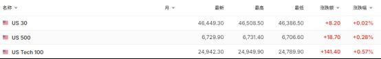 来源:智通财经 智通财经10月2日讯(编辑 黄君芝)周四美股盘前,三大股指期货小幅走高### ,投资者似乎对围绕美 国政府最新一次"关门"的担忧并不感兴趣。 截至发稿,道琼斯指数期货涨0.02%,标普500指数期货涨0.28%,纳斯达克100指数期货涨0.57%。 | 名称 V | 月 ▼ | 圆新 | 품질 | 图设 | 泡肤眼 = | 流染症 ▼ | | --- | --- | --- | --- | --- | --- | --- | | US 30 | | 46,449.30 | 46,508,50 | 46,386.50 | +8.20 | +0.02% | | US 500 | | 6,729.90 | 6,731.40 | 6,706.60 | +18.70 | +0.28% | | US Tech 100 | | 24,942.30 | 24,949.90 | 24,789.90 | +141.40 | +0.57% | (来源:英为财情) 美股三大指数周三录得"四连涨",道指和标普均收于历史新高,因市场寄望政府停摆将是短暂的,从而 限制对经济的严重影响。此前一天,民主党和共和党高层未能在最后 ...