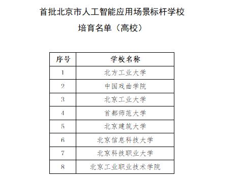 首批北京市人工智能应用场景标杆学校培育名单。图/北京市教委官网 当天,第二批高等教育人工智能典型应用场景培育名单也正式公布,北京第二外国语学院的"多语种影 视翻译垂类模型构建与应用实践"、北京工业大学的"基于星空教育垂类大模型的高校教学质量智慧评价 场景"、北京财贸职业学院的"基于人工智能的托幼一体'智慧育幼'实践"等20个高等教育人工智能典型应 用场景入选。北京市教委要求各学校不断探索实践人工智能技术与高等教育深度融合的创新路径,持续 深化人工智能典型应用场景建设。 | 序号 | 学校名称 | | --- | --- | | 1 | 北方工业大学 | | 2 | 中国戏曲学院 | | 3 | 北京工业大学 | | 4 | 首都师范大学 | | 5 | 北京建筑大学 | | G | 北京信息科技大学 | | 7 | 北京科技职业大学 | | 8 | 北京工业职业技术学院 | 新京报讯(记者杨菲菲)1月28日,北京市教委官网公布了首批北京市人工智能应用场景标杆学校培育名 单,北方工业大学、北京市第二中学、史家胡同小学等50所大中小学校入选。未来,各学校将结合持续 深化人工智能在教育领域的创新应用,联合集团校成员 ...