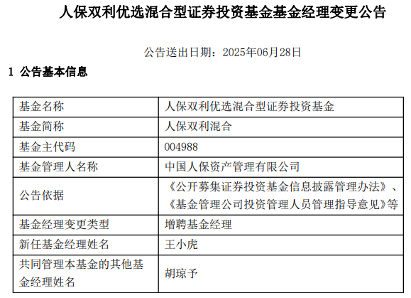 人保双利混合A、C成立于2017年12月4日,截至2025年6月27日,其今年来收益率 为-3.36%、-3.53%,成立来收益率为10.89%、8.70%,累计净值为1.1089元、1.0870元。 | 基金名称 | 人保双利优选混合型证券投资基金 | | --- | --- | | 基金简称 | 人保双利混合 | | 基金主代码 | 004988 | | 基金管理人名称 | 中国人保资产管理有限公司 | | 公告依据 | 《公开募集证券投资基金信息披露管理办法》 | | | 《基金管理公司投资管理人员管理指导意见》等 | | 基金经理变更类型 | 增聘基金经理 | | 新任基金经理姓名 | 王小虎 | | 共同管理本基金的其他基 | 胡琼予 | | 金经理姓名 | | (责任编辑:李荣) 中国经济网北京6月30日讯 近日,中国人保资产管理有限公司公告称,人保双利混合增聘基金经理 王小虎。 王小虎现任公募基金事业部副总经理。曾任中信银行股份有限公司资金资本市场部交易员。2010年 7月起在中国人保资产管理有限公司任职,曾任固定收益投资部投资经理、固定收益投资部高级投资经 理、固定收益投资部资深高级投资经理、 ...