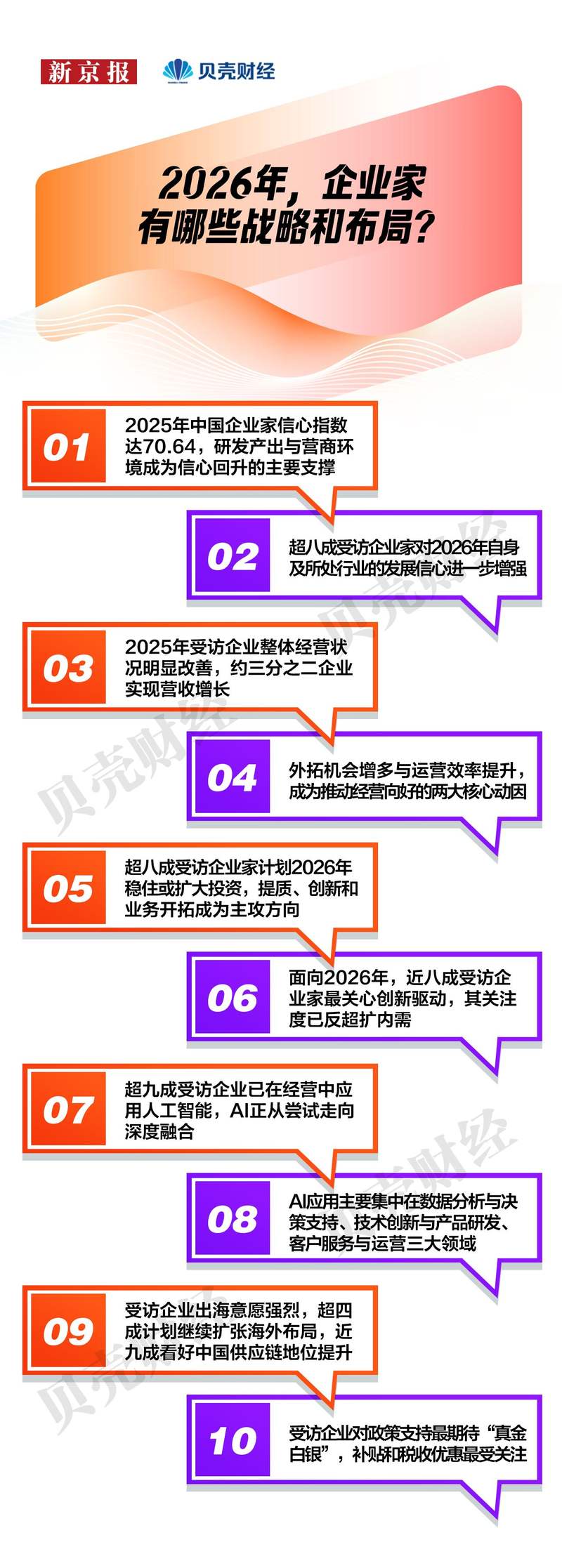 过去一年,世界经济在动荡中前行,外部环境更趋复杂严峻。中央经济工作会议指出,中国经济长期向好的支撑 条件和基本趋势没有改变,要坚持稳中求进总基调,保持社会和谐稳定,实现"十五五"良好开局。 作为经济增长的"压舱石"与创新突破的"发动机",企业的信心与战略选择,始终是观察中国经济趋势的风向标。 2026年伊始,新京报贝壳财经再次面向19个行业的154位企业家展开问卷调研,系统梳理企业家对过去一年经营状 况与发展环境的判断,以及对新一年趋势的展望。 站在"十五五"开局的新起点,中国企业如何稳信心、抓创新、谋出海?又将如何在新一轮科技浪潮与全球重构中 锚定方向、破浪前行?本次调研试图给出来自一线企业家的答案。 通过调查,我们发现: (0)33 况明显改善,约三分之二企业 实现营收增长 外拓机会增多与运营效率提升, 012 成为推动经营向好的两大核心动因 超八成受访企业家计划2026年 稳住或扩大投资,提质、创新和 业务开拓成为主攻方向 面向2026年,近八成受访企 业家最关心创新驱动,其关注 度已反超扩内需 超九成受访企业已在经营中应 用人工智能,Al正从尝试走向 深度融合 Al应用主要集中在数据分析与决 0 % ...