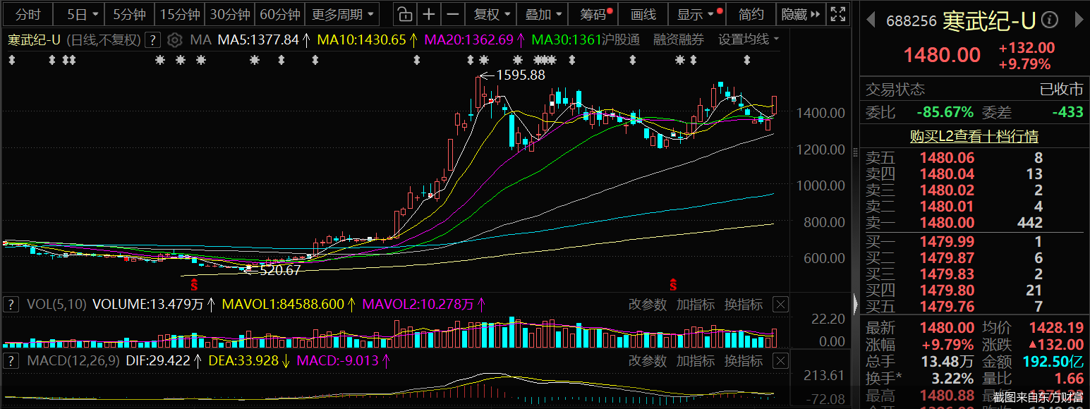 寒武纪股价涨5.08%,同泰基金旗下1只基金重仓,持有1.42万股浮盈赚取89.9万元