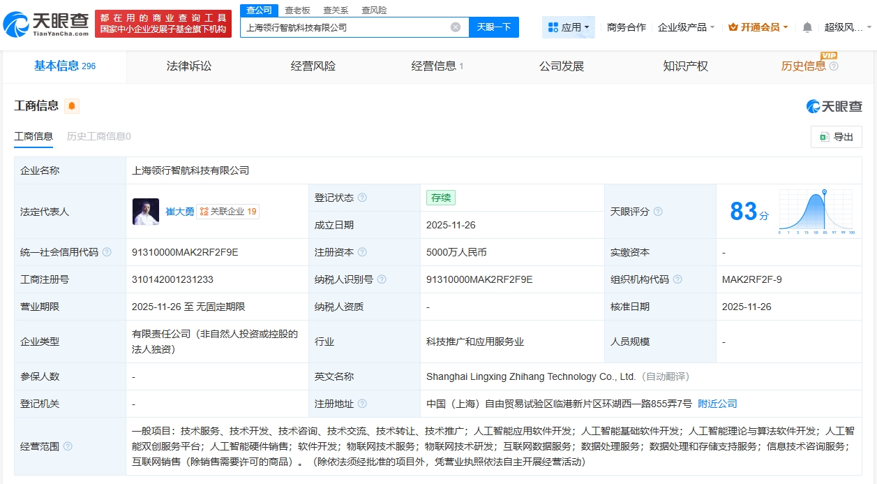 | 都在用的 商业 查 间 工 具 | | 查老板 查关系 更公司 | 查风险 | | | | | --- | --- | --- | --- | --- | --- | --- | | 国家中小企业发展子基金旗下机构 | | 上海领行智航科技有限公司 | | × 天眼一下 | 。 应用 ・ | 商务合作 企业级产品、 ■ 开通 | | 基本信息 296 | 法律诉讼 | 经营风险 | | 经营信息 1 | 公司发展 | 知识产权 | | 工商信息 ● | | | | | | | | 工商信息 历史工商信息0 | | | | | | | | 企业名称 | 上海领行智航科技有限公司 | | | | | | | 法定代表人 | 大勇 【关联企业 19 | | 登记状态 2 | 存续 | | 天眼评分 2 | | | | | 成立日期 | 2025-11-26 | | | | 统一社会信用代码 2 | 91310000MAK2RF2F9E | | 注册资本 2 | 5000万人民币 | | 实缴资本 | | 工商注册号 | 310142001231233 | | 纳税人识别号 2 | 91310000MAK2RF2 ...