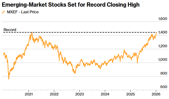 智通财经获悉,受亚洲科技股持续走强和全球股市普遍上涨的提振,新兴市场股票有望创下历史新高。 MSCI新兴市场指数周一一度上涨1.3%,有望超越五年前创下的峰值。韩美半导体和快手科技是当日表 现最佳的股票之一,涨幅均超过10%。 这一涨势反映出投资者对人工智能相关资产的强劲需求,而人工智能相关资产仍然是全球股市的焦点。 韩国和中国台湾的基准股指以及亚太地区指数也均创下新高。 盛宝银行首席投资策略师Charu Chanana表示:"短期来看,新兴市场可能仍能获得支撑,但走势可能较 为谨慎,波动较大,而非直线上涨。有利因素在于,亚洲科技和人工智能供应链的增长势头可能继续推 高指数,尤其是在全球风险偏好保持坚挺的情况下。" 交易员们目前正在寻找新的催化剂来推动下一轮上涨,即将公布的美国经济数据和关键企业财报将为市 场健康状况提供线索。市场对美联储计划降息前景的担忧,以及美国突袭委内瑞拉领导人后地缘政治紧 张局势再度加剧,都令市场情绪保持谨慎。 来源:智通财经 新兴市场资产年初表现强劲,分析师预计,随着美国经济前景疲软对美元构成压力,这波涨势可能持续 到2026年。亚洲众多为人工智能供应链提供关键零部件的供应商也助力该 ...