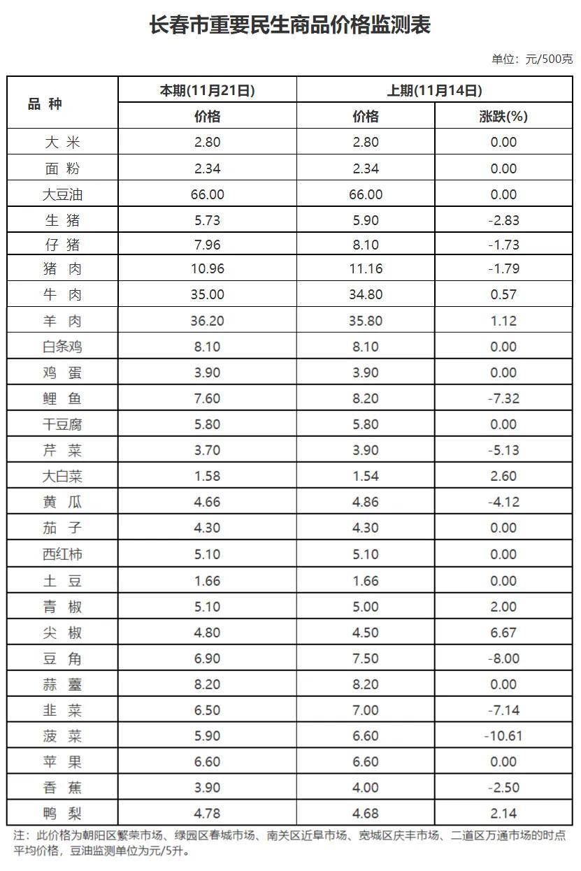 长春市重要民生商品价格情况 为切实筑牢民生保障防线,满足民众基本生活需求,市发改委密切关注重要民生商品价格,加强对粮油、肉、蛋、菜 等重要民生商品的监测力度,全力做好保供稳价工作。据五大农贸市场及生猪养殖户监测数据显示,长春市重要民生 商品品类丰富、流通渠道畅通。 11月21日与上周五(11月14日)相比,粮油副食品和水果价格基本平稳,猪肉、蔬菜价格下降,生猪和仔猪价格下 降。 1.粮油类 粮油供应充足,价格稳定。大米均价每500克(下同)2.80元、面粉2.34元、桶装豆油(5L)66.00元,周环比持平。 2.肉、蛋、禽类 | 品 和 | 本期(11月21日) | | 上期(11月14日) | | --- | --- | --- | --- | | | 价格 | 价格 | 涨跌(%) | | 大米 | 2.80 | 2.80 | 0.00 | | 面 粉 | 2.34 | 2.34 | 0.00 | | 大豆油 | 66.00 | 66.00 | 0.00 | | 生 猪 | 5.73 | 5.90 | -2.83 | | 仔猪 | 7.96 | 8.10 | -1.73 | | 猪 肉 | 10.96 ...