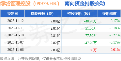 绿城管理控股(09979.HK):11月12日南向资金减持48.7万股
