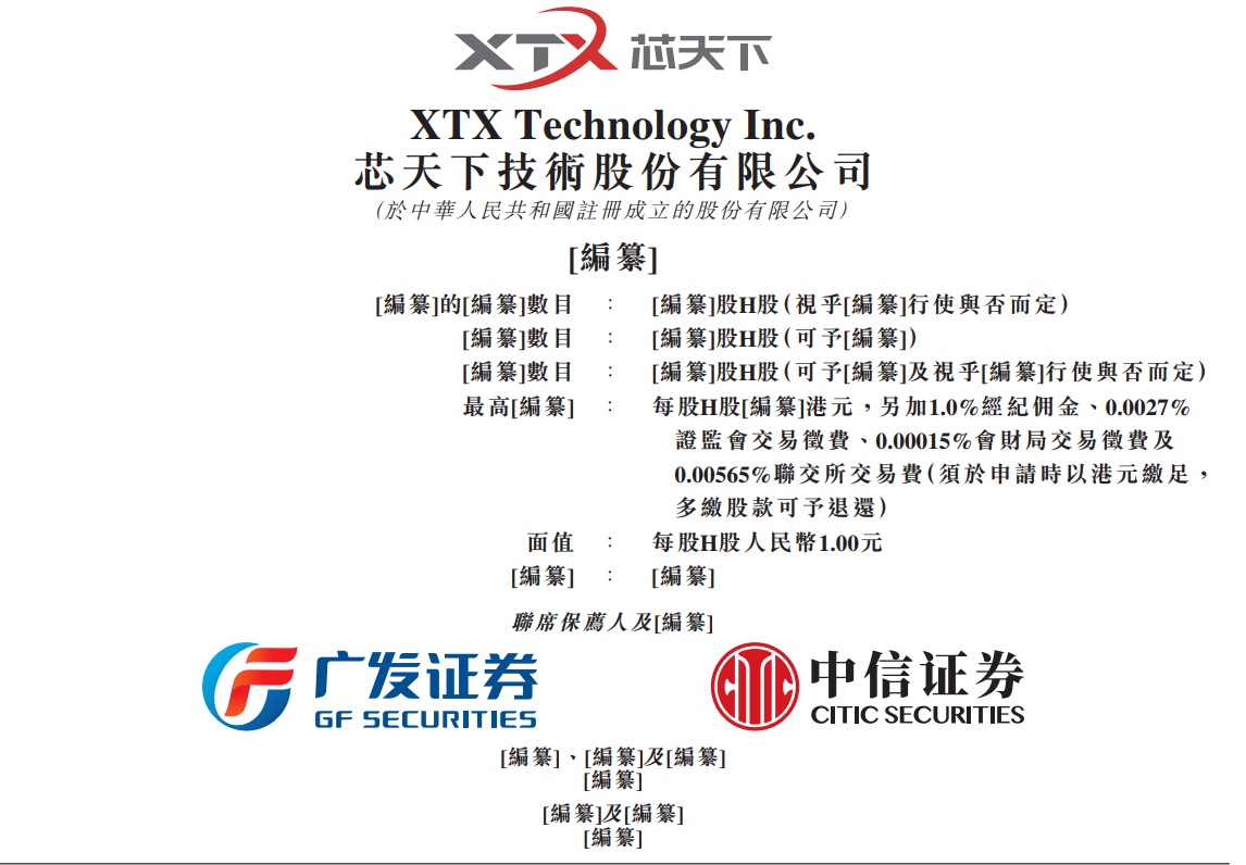| [编纂]的[编纂]數目 | [编纂]股H股(視乎[编纂]行使與否而定) | | --- | --- | | [编纂]數目 | [编纂]股H股(可予[编纂]) | | [编纂]數目 | 「編纂]股H股(可予[編纂]及視乎[編纂]行使與否而定 | | 最高[编纂] . . | 每股H股[編纂]港元,另加1.0%經紀佣金、0.0027% | | | 證監會交易徵費、0.00015%會財局交易徵費及 | | | 0.00565%聯交所交易費(須於申請時以港元繳足 | | | 多繳股款可予退還) | | 面值 | 每股H股人民幣1.00元 | | [编纂] | [编纂] | | 聯席保薦人及[編纂] | | | | 中信证券 | | GF SECURITIES | CITIC SECURITIES | | [編纂]、[編纂]及[編纂] | | 据港交所1月9日披露,芯天下技术股份有限公司(简称:芯天下)向港交所主板递交上市申请,广发证券和中信证券为其联席保荐人。据招股书,芯天下专注 代码型闪存芯片的研究与开发、设计和销售。代码型闪存芯片主要为存储系统启动及运行过程中的代码而设,该等场景需要高稳定度与可靠度。该公司以 ...