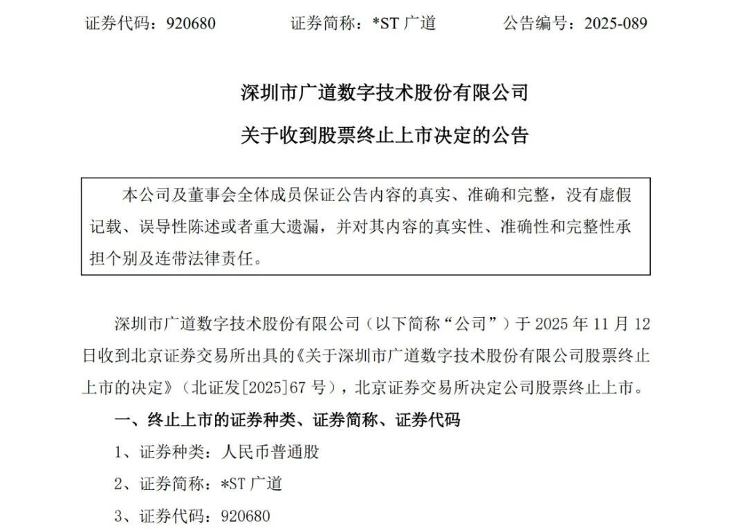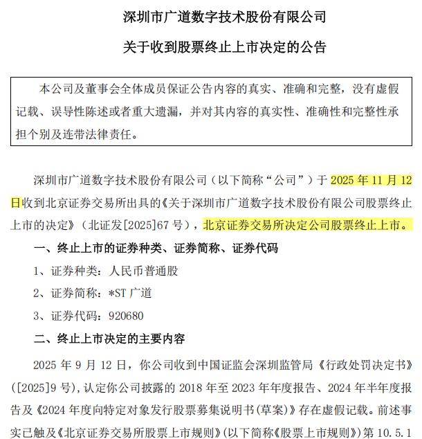 北交所上市公司*ST广道(证券代码:920680)11月12日晚间发布公告称,当日收到《关于深圳市广道数字技术股份有限公司股票终止上市的决定》,北 交所决定公司股票终止上市。 *ST广道被北交所终止上市,与其长时间、系统性财务造假有关。中国证监会深圳监管局于9月12日下发的《行政处罚决定书》认定,*ST广道披露的2018 年至2023年年度报告、2024年半年度报告及《2024年度向特定对象发行股票募集说明书(草案)》存在虚假记载。这触及《北京证券交易所股票上市规 则》第10.5.1条第(七)项规定的重大违法强制退市情形。 具体来看,*ST广道通过制作虚假购销合同、发票、银行回单、发货通知单及入库单等方式,虚构销售和采购业务,从而虚增营业收入及营业成本。 来源:千图网 根据上述《行政处罚决定书》,中国证监会深圳监管局对*ST广道责令改正,给予警告,并处以1000万元罚款。同时,*ST广道时任董事长、总经理、控 股股东、实际控制人金文明,时任董事、副总经理、财务负责人、董事会秘书赵璐等核心决策与管理人员,被认定为主要负责人员,遭到了严厉的行政处 罚与市场禁入措施。 *ST广道全称"深圳市广道数字技术股份有限公司 ...