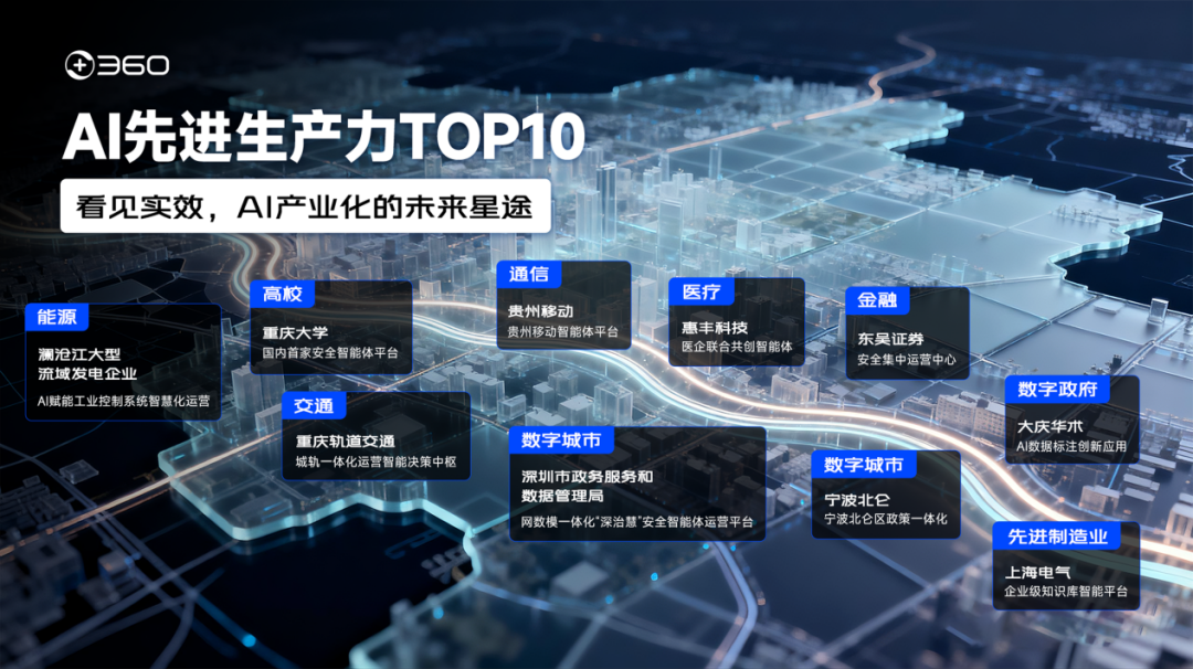 当大模型的浪潮逐渐沉淀,产业界正在核心关切一个命题:AI技术如何深度融入产业生产线,真正转化为可量化、可验证的生产力?近日,360甄选的"AI 先进生产力TOP10"案例发布,覆盖高校、交通、金融、能源、政务等十大核心领域,全景呈现智能体驱动业务转型的实效,为千行百业提供了一份可借 鉴、可落地的AI实战指南。 作为网络安全深耕者,360的战略转型脉络清晰。从"幕后卫士"到AI时代的"产业赋能者",其核心源于对技术价值的深刻洞察。"AI的终极价值在于穿透产业 痛点、创造实际价值",360相关负责人表示。基于此,360构建起L1—L4多智能体蜂群体系,打通AI应用全链路,将技术真正嵌入产业腹地。 上海电气作为全球领先的工业级绿色智能系统解决方案提供商,曾受知识孤岛、业务低效困扰。与360共建"企业级知识库智能平台",员工检索效率升至 90%,高价值业务场景中实现工作效率提升80%,并培育活跃的AI运营团队,为企业长远发展提供了支撑。 拥抱智能化浪潮,深圳市政务服务和数据管理局"深治慧"安全智能体运营平台,突破传统孤岛模式,实现安全资源统一管控、威胁全局感知和协同响应。既 提升了运营效率,又降低了管理和人力成本,为 ...
