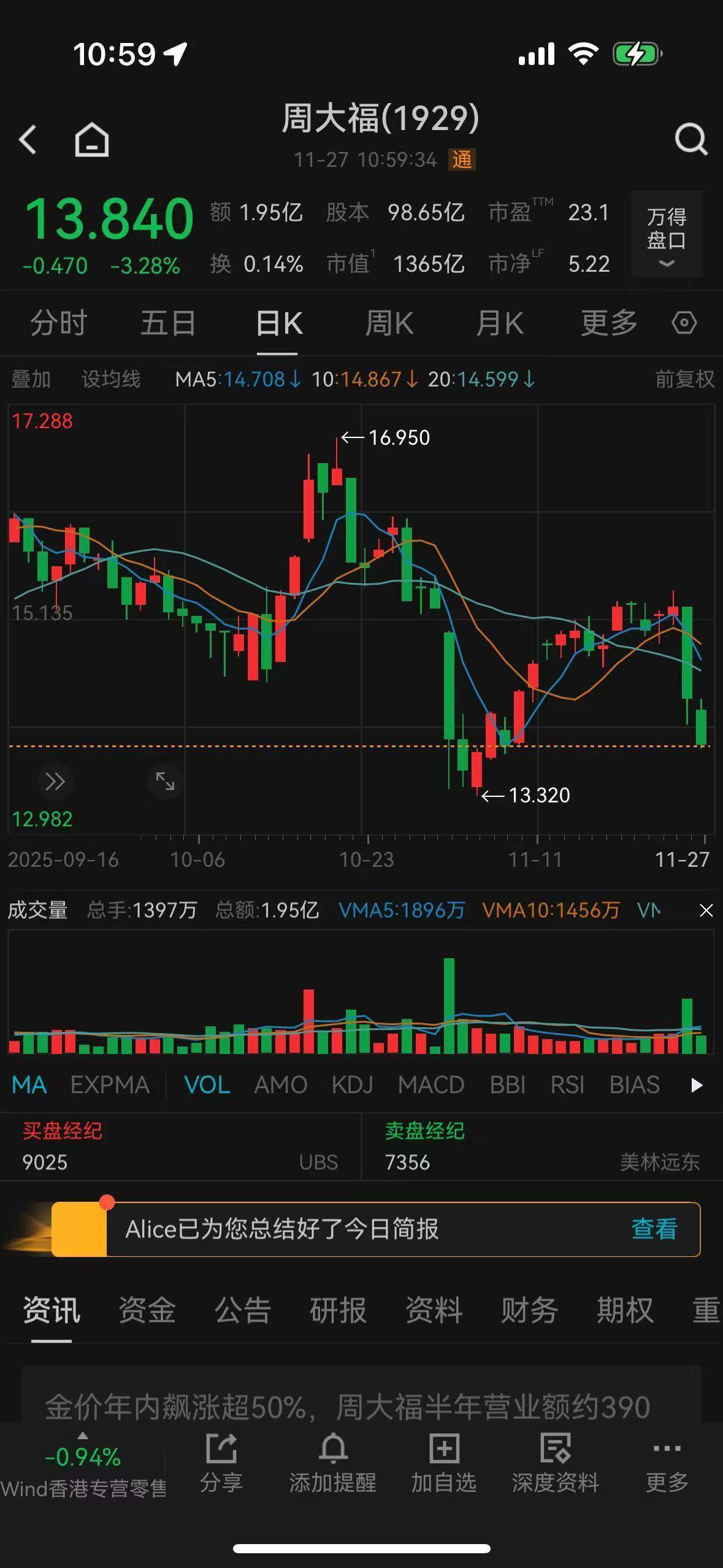 潮新闻客户端 记者 吴恩慧 国际金价在10月份冲上4300美元/盎司历史高点之后,近期一直保持高位震荡。尽管有所回调,但截至目前,今年金价已涨超58%。在这样的"黄金大年",对 于头部黄金上市公司的业绩,市场尤为关注。 近日,周大福(01929.HK)公布2026财政年度中期业绩(2025年4月1日至9月30日)。报告期内,公司营业额为389.86亿港元,同比减少1.1%;经营溢利为 68.23亿港元,同比增长0.7%;股东应占溢利为25.34亿港元,较去年同期增长0.1%。 业绩发布后的次日(11月26日),周大福的股价低开低走,截至当天收盘,周大福报14.310港元/股,当日跌幅6.10%。11月27日,周大福开盘再度下挫,截 至发稿时跌超3%。 "一口价"金饰产品成为亮点 在国际金价上涨背景下,周大福高毛利定价黄金饰品(即"一口价"金饰)成为业绩增长的核心驱动力,报告中表示:在高毛利定价首饰贡献提升及黄金价格 上涨的支持下,集团毛利率维持于30%以上。 此外,中国黄金协会指出,2025年11月起实施的新增值税政策将推动企业注重高附加值精品开发。据中信证券分析,此类产品多采用"一口价"模式,通过设 计增值 ...