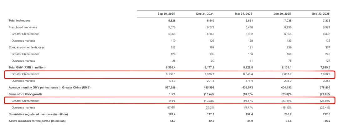 在纳斯达克上市尚不满一年的霸王茶姬传出回港上市消息。 1 月 8 日,市场消息称霸王茶姬正考虑在香港上市。彭博报道称,霸王茶姬已就上市计划与投资银行展开初步沟通,融资金额或达数亿美元,交易最快有 望年内完成。霸王茶姬否认传言,称目前暂无回港上市计划。 现在的确不是霸王茶姬回港上市的理想节点。作为中国茶饮行业过去三年增长最快、且一度市值仅次于蜜雪冰城的品牌,霸王茶姬似乎正逐渐失去它的魔 力。 过去一年,霸王茶姬的营收与利润增长均明显放缓,增速已连续三个季度同比下滑。表现最差的去年第三季度,霸王茶姬甚至陷入负增长境地,当季营收 同比下降 9.4%、净利润同比下降近 4 成,季度 GMV 当季也首次同比转负。 在中国市场,霸王茶姬的核心经营指标单店月均 GMV 已经连续 7 个季度环比下滑,且同店 GMV 增长率自2024 年底以来已连续四个季度深陷负值,跌幅 在去年第三季度扩大至近 28%。 | | Sep 30, 2024 | Dec 31, 2024 | Mar 31, 2025 | Jun 30, 2025 | Sep 30, 2025 | | --- | --- | --- | --- | --- | - ...