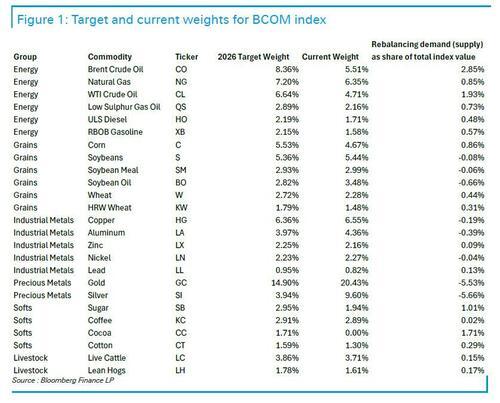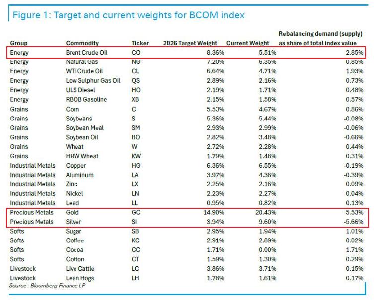 彭博大宗商品指数(BCOM)年度再平衡将于本周五启动,走势火热的白银面临大规模抛售压力。 据彭博数据,此次再平衡将黄金权重从20.4%下调至14.9%,白银也面临权重削减,权重将从9.6%降至3.94%,再平衡期将从1月8日盘后开始,并持续至14日 (再平衡执行日期1月9日-15日)。 彭博大宗商品指数采用年度再平衡机制,权重计算基于三分之二的交易量和三分之一的全球产量,并在商品、板块和组别层面设置权重上限。根据指数规 则,单一商品权重不得超过15%,以维持多元化。 | | | | | | Rebalancing demand (supply) | | --- | --- | --- | --- | --- | --- | | Group | Commodity | Ticker | 2026 Target Weight | Current Weight | as share of total index value | | Energy | Brent Crude Oil | CO | 8.36% | 5.51% | 2.85% | | Energy | Natural Gas | NG | 7.20% | ...