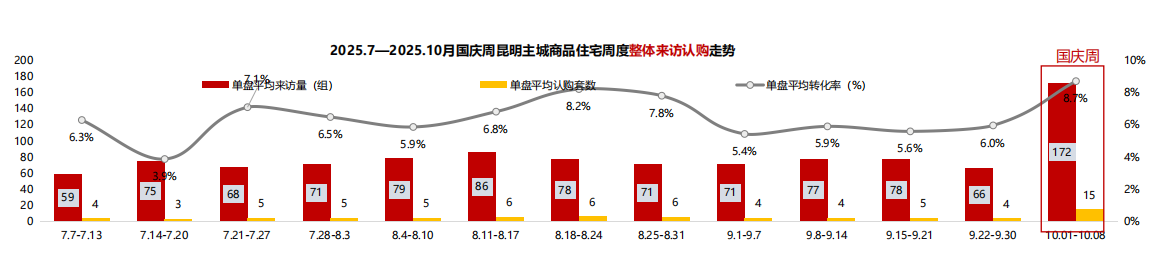 有点意料之外,昆明楼市的"银十"小爆开场了。 据克而瑞发布的数据显示,国庆期间昆明楼市迎来一波小高峰,整体来访、成交双双上涨。总成交1055套,同比上涨19%;总体来访12371组,同比上涨 51%。 需要说明的是,因备案数据有一定的滞后性,多个项目实际成交的数据还要更高一些。例如,保利城官方发布的海报信息中,其国庆双节期间的销售额达 1.09亿元,卖出81套住宅,比统计数据还要高出10套之多。 落位到具体项目,卖得最好的楼盘,大多还是熟面孔,都在意料之中。有意思的是,节后其中部分楼盘宣布涨价,带来了一波小的"涨价潮"。 新规项目更受青睐,首置至改善层认购套数成倍增长 数据结果显示,国庆假期,新规住宅项目的认购套数提升显著。邦泰·悦九章·彩云、万科桂语东方、万科都会半岛、邦泰映悦、邦泰观云、龙湖峯萃6个项目 的转化率均在10%以上,认购套数在25-57套,一如既往的畅销。 图片来源:克而瑞 产品类型以改善型、高端改善型为主的邦泰春华序、邦泰观云、义承·丹霞翠屿、龙湖峯萃,受总高总价的影响,认购套数在11-37套,转化率约5%-10%。 龙湖峯萃作为今年新入市的项目,是滇池国际度假区少有的零公摊新品,国庆假期的 ...