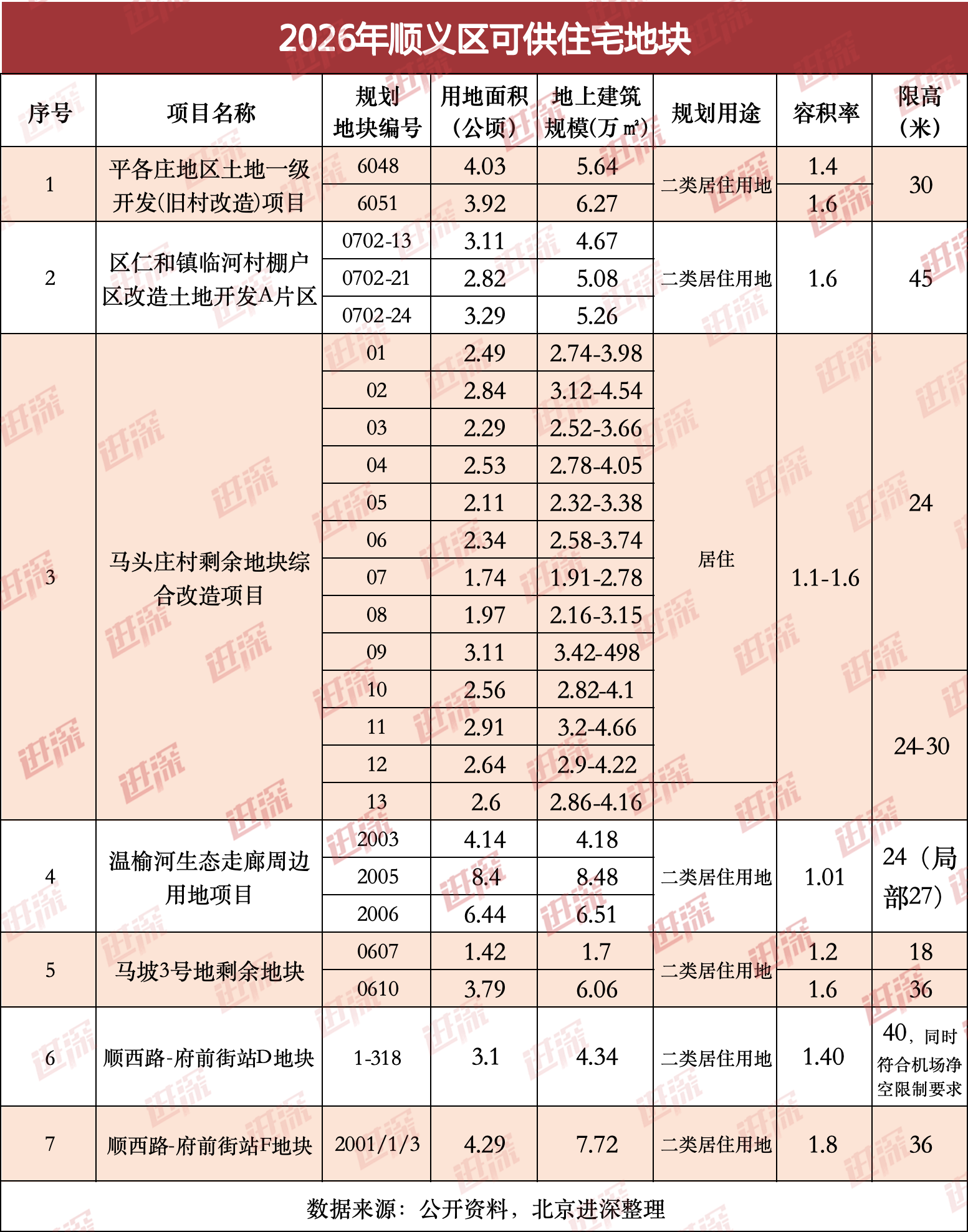 经济指标与去年出让的北京润园地块完全相同,容积率1.01,限高24米(局部27米)。 这3块地就在北京润园的西北方向,最大的一幅是2005地块,建筑规模8.4万㎡,与北京润园同样是临河地块。 | | | | 2026年顺义区可供住宅地块 | | | --- | --- | --- | --- | --- | | 序号 | 项目名称 | 规划 | 用地面积 | 地上建筑 | | | | 地块编号 | (公顷) | 规模(万 m2 | | 1 | 平各庄地区十地一级 | 6048 | 4.03 | 5.64 | | | 开发(旧村改造)项目 | 6051 | 3.92 | 6.27 | | | 区仁和镇临河村棚户 | 0702-13 | 3.11 | 4.67 | | 2 | 区改造十地开发A片区 | 0702-21 | 2.82 | 5.08 | | | | 0702-24 | 3.29 | 5.26 | | | | 01 | 2.49 | 2.74-3.98 | | | | 02 | 2.84 | 3.12-4.54 | | | | 03 | 2.29 | 2.52-3.66 | | | | 04 | 2.5 ...