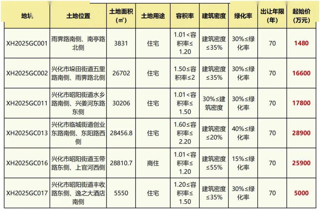 兴化城区及郊区的6块地挂牌出让 XH2025GC011地块位于兴化市昭阳街道水乡路南边、兴姜河东路东边,出让面积为30206平方米,起拍价是17800万元,其属于城郊。 将要新建普通住宅商品房 这6块地情况如下: | 神社 | 士地位置 | 十地面积 (m2) | 十地用途 | 容积率 | 建筑密度 | 绿化率 | 出让年階 (年) | 起始价 (万元) | | --- | --- | --- | --- | --- | --- | --- | --- | --- | | XH2025GC001 | 雨雾路南侧、南亭路 | 3831 | 住宅 | 1.01<容 积率< | 建筑密度 | 30%≤绿 | 70 | 1480 | | 北侧 | | | | | <35% | 化率 | | | | | | | | 1.20 | | | | | | XH2025GC002 | 兴化市垛田街道五里 | 26702 | 住宅 | 1.50≤容 | 建筑密度 | 30%≤绿 | 70 | 16600 | | 路南侧、雨霁路北侧 | | | | 相率<2 | ≤35% | 化率 | | | | 兴化市昭阳街道水乡 | | | ...