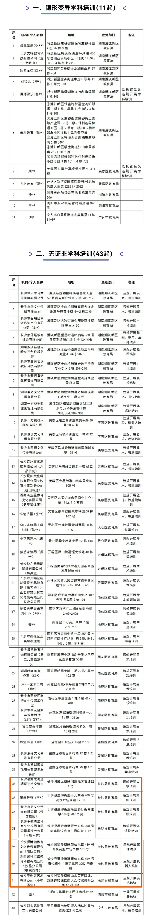星沙时报2026-01-10 10:09:24 为持续巩固"双减"工作成效,给孩子们营造健康的成长环境,长沙始终对违规校外培训保持"零容忍"态 势。记者获悉,2025年12月,全市共查处各类违规校外培训54起,其中隐形变异学科培训11起、无证非 学科类培训43起,相关违规行为已被依法依规处置。 无证非学科培训(43起) > 二、 | 序 | 机构/个人名称 | 地址 | 查处部门 | 备注 | | --- | --- | --- | --- | --- | | 号 | | | | | | 1 | 长沙快乐木马文 | 湘江新区银盆岭街道岳麓大道 | 湖南湘江新区 | 违规开展 美 | | | 化传媒有限公司 | 57 号奥克斯广场 8、9 栋 205. 206 | 教育局 | 术、书法培训 | | 2 | 长沙典华文化传 | 湘江新区金山桥街道雷锋大道金 | 湖南湘江新区 | 违规开展美 | | | 播有限公司 | 地三千府商业街 4~2 栋二楼 | 教育局 | 术、书法培训 | | 3 | 长沙市岳麓区言 说培训中心有限 | 湘江新区大顶街道金茂悦商业街 | 湖南湘江新区 | 违规开展主 | | | 公司(丰 ...