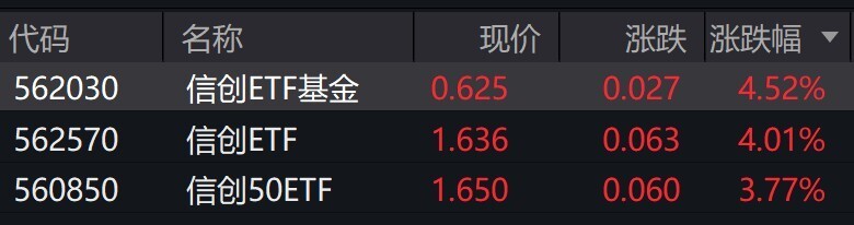 | 代码 | 名称 | 现价 | 涨跌 涨跌幅 | | | --- | --- | --- | --- | --- | | 562030 | 信创ETF基金 | 0.625 | 0.027 4.52% | | | 562570 | 信创ETF | 1.636 | 0.063 | 4.01% | | 560850 | 信创50ETF | 1.650 | 0.060 | 3.77% | 有券商表示,DeepSeek引领国产AI算力与头部大模型软硬协同,助推国内AI产业加速发展,国内AI产业有望迎 来发展的新机遇;大国科技博弈背景下信创发展大势所趋,从政策、上市公司业绩两个维度看,信创产业有望 持续加速发展,国产AI算力与信创有望共同迎来拐点。 每经记者:叶峰每经编辑:肖芮冬 信创概念股走高,海光信息、用友网络涨超6%,深信服涨超4%。 受盘面影响,信创相关ETF涨约4%。 每日经济新闻 ...