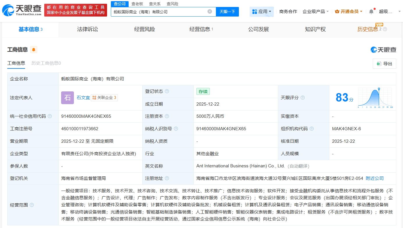每经AI快讯,天眼查工商信息显示,近日,蚂蚁国际商业(海南)有限公司成立,法定代表人为石文宜,注册资本5000万元人民币,经营范围包括信息技术咨 询服务、软件开发、接受金融机构委托从事信息技术和流程外包服务等。股东信息显示,该公司由蚂蚁国际商业(上海)有限公司全资持股。 | | 登公司 查老板 查关系 查风险 都在用的 商业查询 工具 | | | | --- | --- | --- | --- | | | 蚂蚁国际商业(海南)有限公司 天眼一下 品成用 = 家中小企业发展子基金旗下机构 | × | 商务合作 | | 基本信息 3 | 法律诉讼 经营风险 公司发展 | 经营信息 1 | 知识产 | | 工商信息 ● | | | | | 工商信息 历史工商信息0 | | | | | 企业名称 | 蚂蚁国际商业(海南)有限公司 | | | | 法定代表人 | 登记状态 ⑦ 信 石文官 錠 关联企业 3 | 存续 | 天眼评分 2 | | | 成立日期 | 2025-12-22 | | | 统一社会信用代码 2 | 91460000MAK4GNEX65 注册资本 2 | 5000万人民币 | 实缴资本 | | 工商注 ...