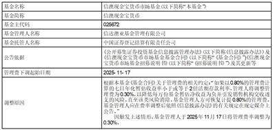 | 馬会名称 | 信應現金宝寶面市施基金(以下同称"本馬会" | | --- | --- | | 基金简称 | 信息展会紧资质。 | | 所含更代时 | 025672 | | 斯金管理人名称 | 信达测量基金管理有限公司 | | 基金托管人名称 | 中国语泰联记结算有限责任公司 | | 公司签署 | 《公开等集团身教师会信息被调管理办法》(X下同系《信息被器办法》 | | | (信源成金宝装电申均基金基金台团(以下资格"《格会合同》(《消费发金 | | | Partify (4 (FEWSED ARREN) (H) (R) SHERE (H) ST PROSS | | 管理费下调起始日期 | 2026- 11- 17 | | DE 43 BOLEE | 根据本基金(基金合肥)关于管理费的剧关的定;如果以0.80%的管理费; | | | 算的七段中化有些或资率今于或等于2倍活用在家利率,合理人将调整分 | | | 用费为0.30%,以降低等方位基金管估净效直为负并引发销售机构安政运 | | | 支的风险,在任画类风險消障,基金管理人才可恢复计提0.80%的管理费。 | | | 基金管理人应在壹年调整后依照(信息 ...
