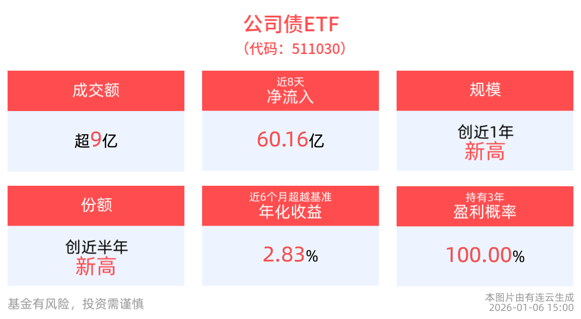 成交额超9亿元,公司债ETF(511030)近8个交易日净流入60.16亿元