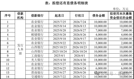 本次债券是山西省安装在境内债券市场的首次公开亮相,也是山西资本市场2026年第一家获批的10亿以 上发债项目。 01、发行13.5亿债券 根据中国证监会批复,该债券注册有效期为24个月,可分期发行,发行总面值不超过13.5亿元。该债券 早在2025年9月就由董事会审议通过,但这笔债券注册金额从9月审议通过的15亿元变成了目前证监会批 复通过的13.5亿元。 | | | | | | | 单位:万元 | | --- | --- | --- | --- | --- | --- | --- | | 序号 | 借款 机构 | 借款银行 | 起息日 | 行权日 | 债务金额 | 拟使用本次募集 资金偿还的金额 | | | | 农业银行 | 2025/7/25 | 2026/7/24 | 10,000.00 | 10,000.00 | | 2 | | 农业银行 | 2025/8/14 | 2026/8/13 | 10,000.00 | 10,000.00 | | 3 | | 农业银行 | 2025/8/28 | 2026/8/27 | 7,000.00 | 7,000.00 | | 4 | | 邮储银行 | 2025/8/ ...