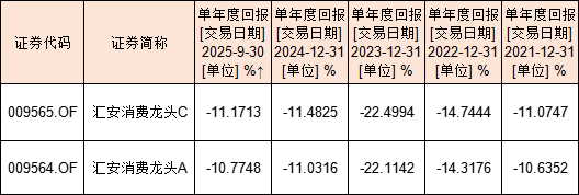还真有一只基金连续5年负收益,并且负收益超-10%。 | 证券代码 | 证券简称 | 单年度回报 单年度回报 单年度回报 单年度回报 单年度回报 [交易日期] [交易日期 交易日期 [交易日期] 交易日期] 2025-9-30 2024-12-31 2023-12-31 2022-12-31 2021-12-31 | | | | | | --- | --- | --- | --- | --- | --- | --- | | | [单位] %↑ | | [单位] % | [单位] % | [单位] % | [单位] % | | 009565.OF | 汇安消费龙头C -11.1713 | | -11.4825 | -22.4994 | -14.7444 | -11.0747 | | 009564.OF | 汇安消费龙头A -10.7748 | -14.3176 | -11.0316 | -22.1142 | | -10.6352 | 经过"924"行情以来,已经有很多翻倍基了 然后,突发奇想,有没有业绩差的基金呢? 数据来自Wind,截至2025年11月20日 究竟什么样的投研实力能搞出这么烂的业绩呢? 还不如 ...