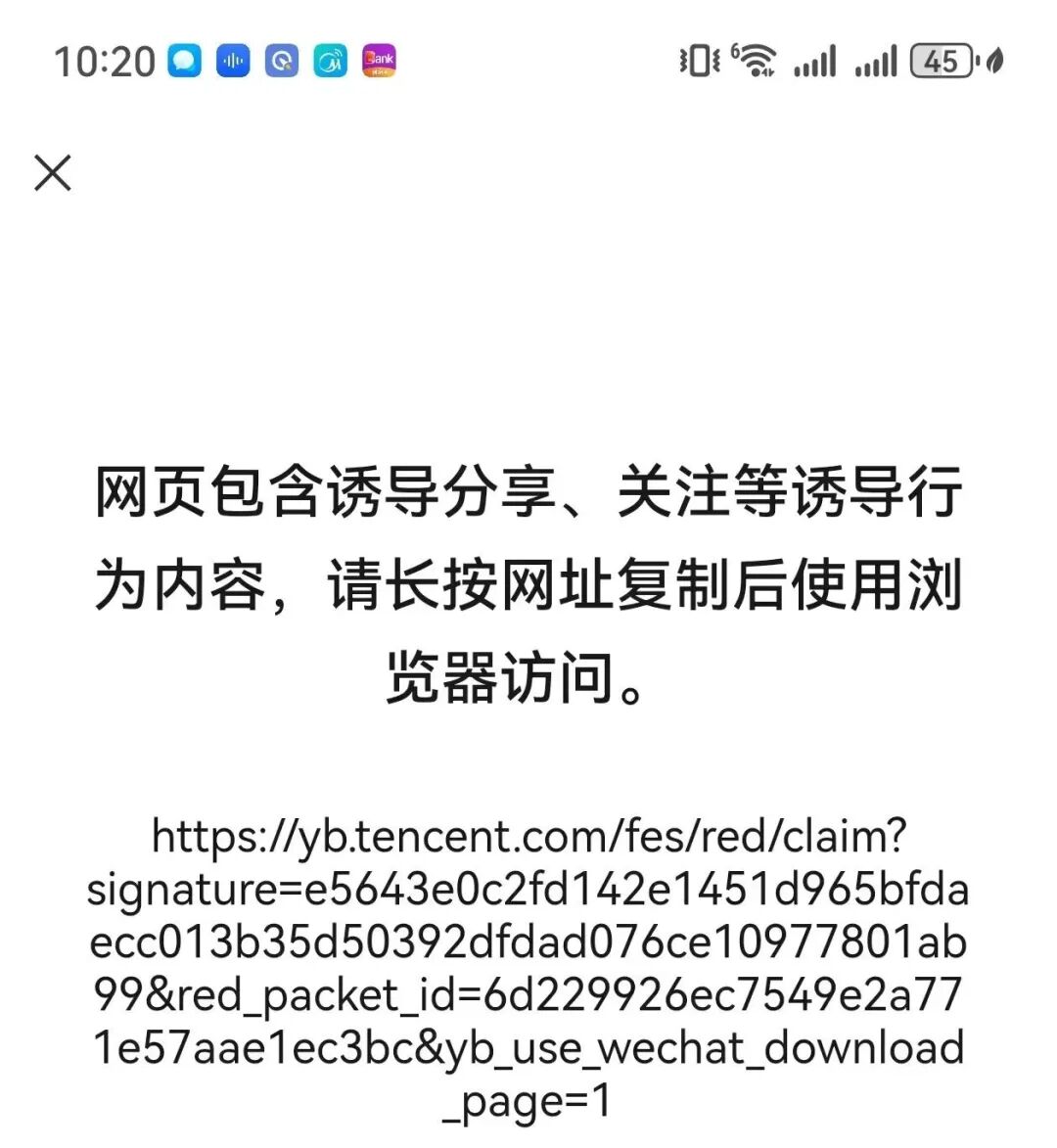 2月4日,有网友爆料,在微信端已经打不开元宝红包。南方财经记者也尝试打开元宝领红包,页面显 示:网页包含诱导分享、关注等诱导行为内容,请长按网址复制后使用浏览器访问。 对此,微信官方回应称:"我们收到用户针对元宝的反馈和投诉,其相关春节营销活动存在通过'做任 务''领红包'等方式诱导用户高频分享链接到微信群等场景,干扰平台生态秩序、影响用户体验、对用户 造成骚扰。经研判,对元宝的违规链接进行处置,限制其在微信内直接打开,相关处置措施即日生 效。" 对此,有网友吐槽:"这小子最精了,到时候别的 AI 要分享链接都没法了。" (文章来源:21世纪经济报道) ...
