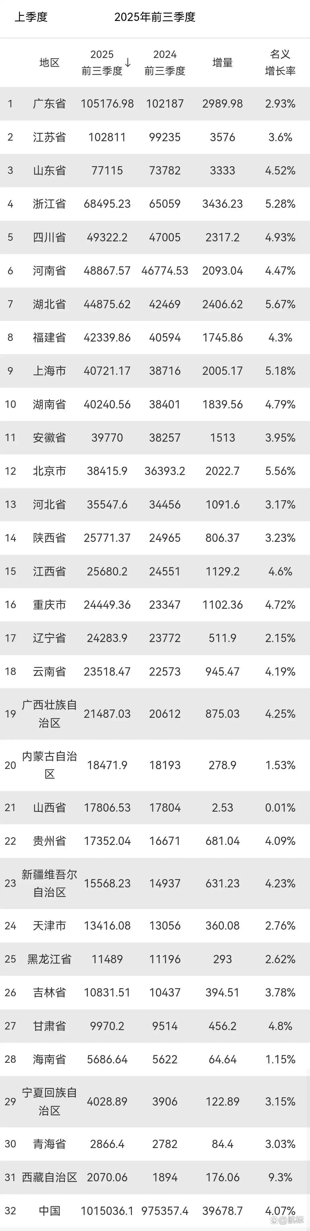 今年以来,在稳增长政策持续发力与新质生产力培育加速的双轮驱动下,各地经济韧性凸显。前三季度全国GDP突破101万亿元,同比增长4.07%,区域格 局悄然生变。东部大省稳中有进,中西部黑马频出,四川逼近5万亿大关,重庆与江西差距缩小至千亿之内,甘肃以近5%的增速领跑西北……这场省域经济 的"排位赛"背后,隐藏着怎样的增长密码? 重庆与江西的GDP差距缩窄至230亿元,这场"贴身竞逐"实为两种模式的较量。重庆以汽车制造为矛,新能源汽车产量同比增长40%,长安阿维塔、赛力斯 问界等品牌带动产业链升级,工业投资增速达12.3%。而江西凭借锂电、光伏"双王牌",晶科能源上饶基地产出全球1/8光伏硅片,赣锋锂业碳酸锂产能居全 球前三。 | | 地区 | 2025 | 2024 | 增量 | 名义 | | --- | --- | --- | --- | --- | --- | | | | 前三季度 | 前三季度 | | 增长率 | | 1 | 广东省 | 105176.98 102187 | | 2989.98 | 2.93% | | 2 | 江苏省 | 102811 | 99235 | 3576 | 3.6% | | 3 ...