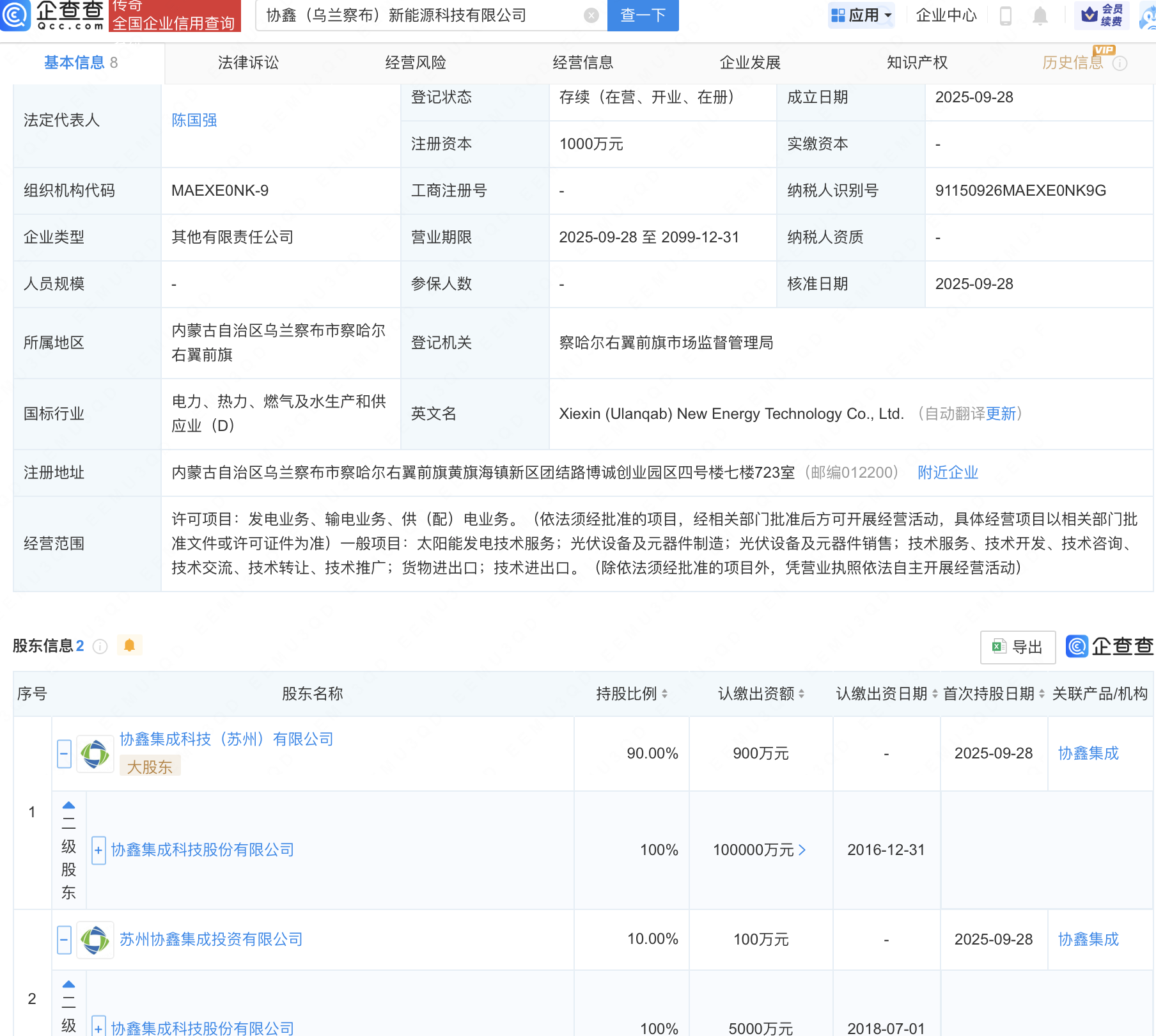 企查查APP显示,近日,协鑫(乌兰察布)新能源科技有限公司成立,注册资本1000万元,经营范围包含:太阳能发电技术服务;光伏设备及元器件制造; 光伏设备及元器件销售等。企查查股权穿透显示,该公司由协鑫集成(002506)间接全资持股。 | 十百合 R 全国企业信用查询 | 协鑫(乌兰察布)新能源科技有限公司 | | × 查一下 | | --- | --- | --- | --- | | 基本信息 8 | 法律诉讼 | 经营风险 | 经营信息 | | 法定代表人 | 原国 | 登记状态 | 存续(在营、开业、 | | | | 注册资本 | 1000万元 | | 组织机构代码 | MAEXEONK-9 | 工商注册号 | | | 企业类型 | 其他有限责任公司 | 营业期限 | 2025-09-28 至 2099- | | 人员规模 | | 参保人数 | l | | 所属地区 | 内蒙古自治区乌兰察布市察哈尔 右翼前旗 | 登记机关 | 察哈尔右翼前旗市场! | | 国标行业 | 电力、热力、燃气及水生产和供 应业(D) | 英文名 | Xiexin (Ulangab) Nev | | 注册地址 | 内蒙古自治区 ...