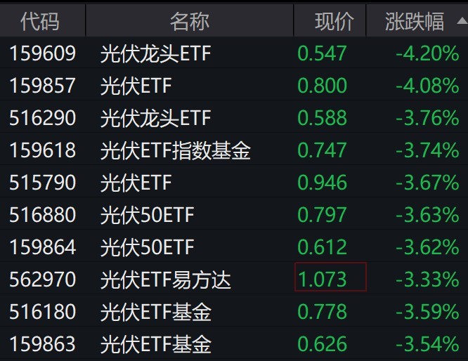 | 代码 | 名称 | 现价 | 涨跌幅 | | --- | --- | --- | --- | | 159609 | 光伏龙头ETF | 0.547 | -4.20% | | 159857 | 光伏ETF | 0.800 | -4.08% | | 516290 | 光伏龙头ETF | 0.588 | -3.76% | | 159618 | 光伏ETF指数基金 | 0.747 | -3.74% | | 515790 | 光伏ETF | 0.946 | -3.67% | | 516880 | 光伏50ETF | 0.797 | -3.63% | | 159864 | 光伏50ETF | 0.612 | -3.62% | | 562970 | 光伏ETF易方达 | 1.073 | -3.33% | | 516180 | 光伏ETF基金 | 0.778 | -3.59% | | 159863 | 光伏ETF基金 | 0.626 | -3.54% | 受盘面影响,光伏相关ETF跌超3%。 (文章来源:每日经济新闻) 光伏概念股走低,阳光电源、德业股份跌超6%,通威股份、正泰电器跌超3%。 有机构表示,光伏产业处于周期 ...