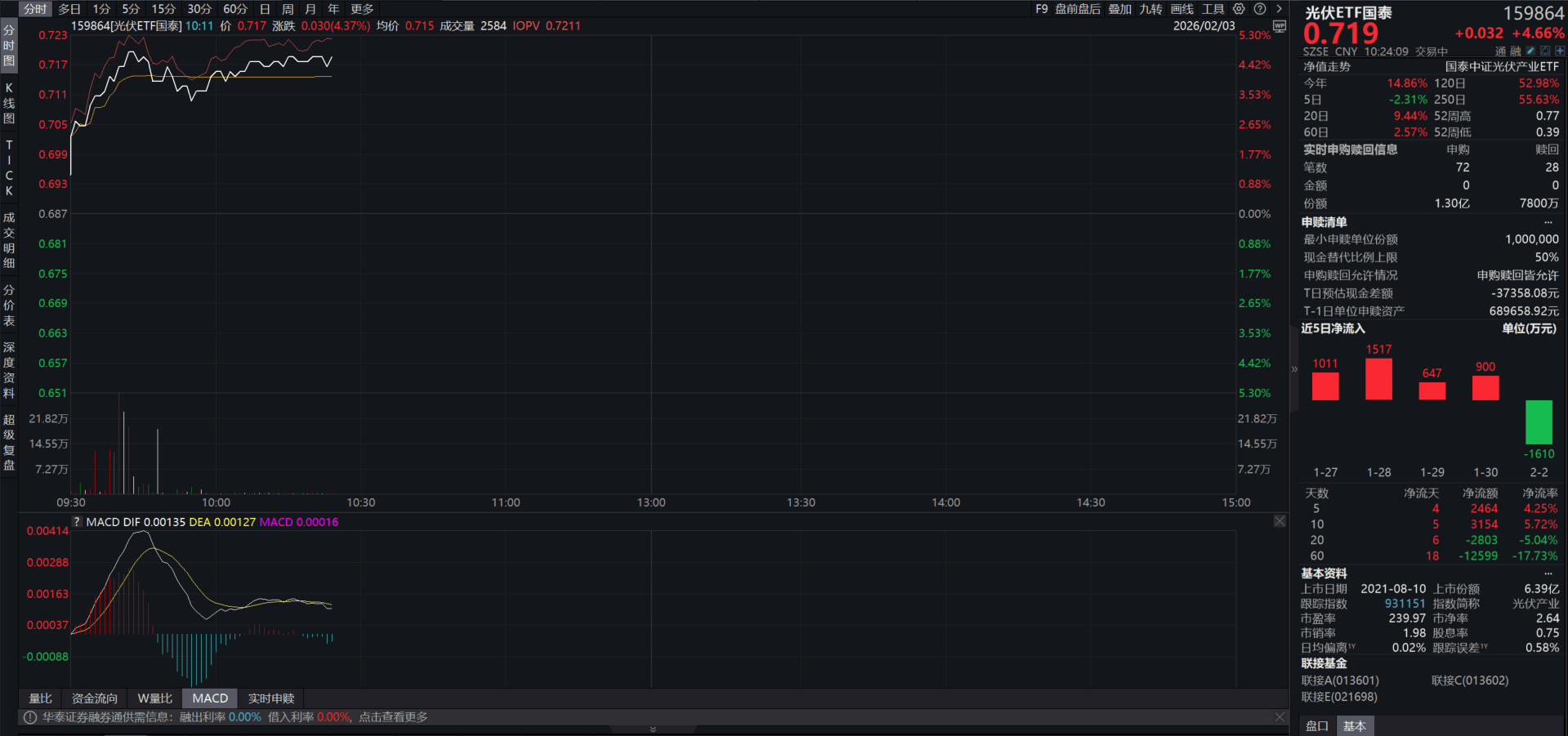 在此背景下,光伏行业的投资机会也逐步清晰,龙头企业与技术创新赛道成为两大核心布局方向。一方面,随着行业集中度提升,具备规模优势、技术储备 和全球渠道的龙头企业将率先受益于价格修复与需求增长,成为行业复苏的核心抓手;另一方面,N型硅片、高效电池、贵金属替代、储能协同等技术创新 领域,将诞生具备高成长性的投资标的,成为光伏板块长期增长的主线。对于普通投资者而言,直接布局个股面临技术路线判断、个股波动等风险,通过光 伏主题ETF把握行业整体机会,成为更便捷、高效的选择。 光伏ETF国泰(159864)作为跟踪中证光伏产业指数的标的,成为投资者布局光伏行业的优质工具。该基金成立于2021年7月28日,管理费率0.50%、托管费 率0.10%,费率处于行业合理水平。该产品覆盖硅料、硅片、电池、组件、光伏设备等全产业链核心环节,持仓占比向龙头集中,精准把握光伏行业龙头受 益的行业趋势。在行业基本面持续改善、价格修复与技术创新双轮驱动的背景下,光伏ETF国泰(159864)有望充分受益于光伏行业的复苏行情,成为普通 投资者分享光伏行业高质量发展红利的重要载体。 2月3日,光伏ETF国泰(159864)涨超4%,成为市场焦点 ...